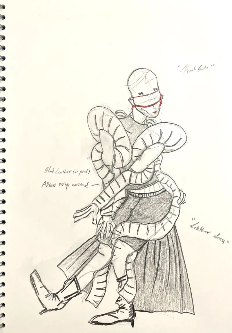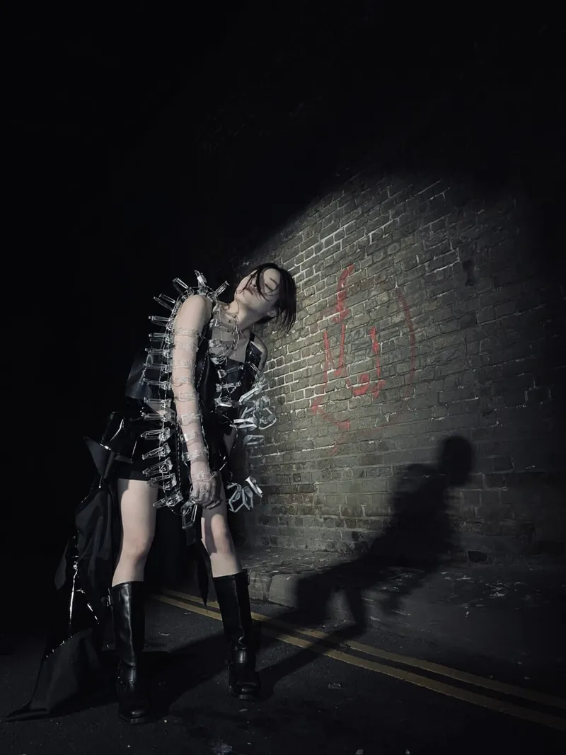 I explored a lot of different dystopian movies, trying to see what different kinds of futures have unique charms. Among them, “the matrix” fascinates me most. It is a movie I grew up with, and I really like the spy atmosphere in it as well as the very advanced special effects and plot at that time. Therefore, my skirt design is influenced to a large extent by the big windbreaker worn by the character in matrix. Self-protection was the emotion I felt most during the preliminary research. I always fantasize about how I would feel if I really went to the future, surrounded by AI and high-tech creations. I’m supposed to be panicked and insecure. So that was my inspiration for the exterior decoration.