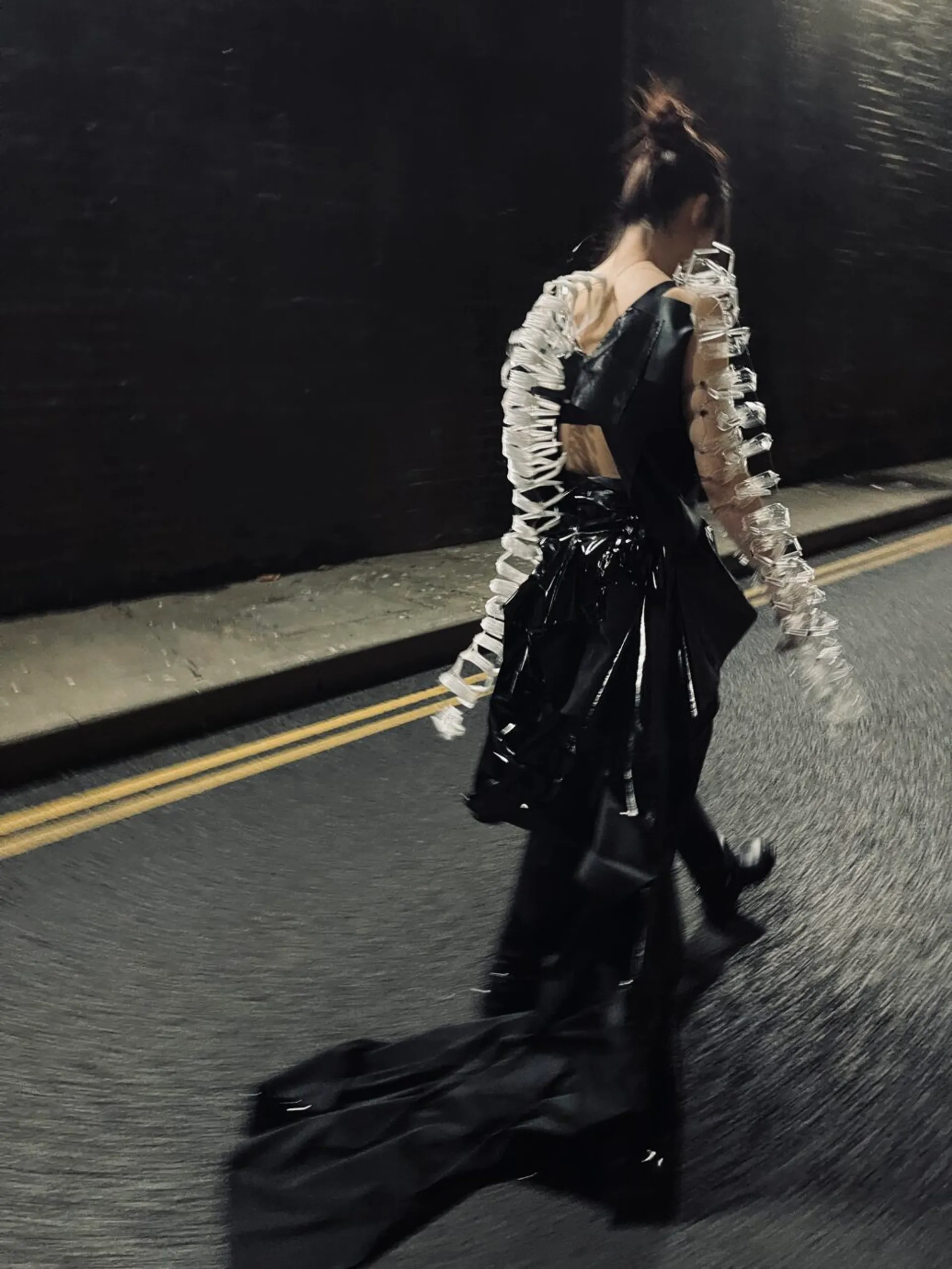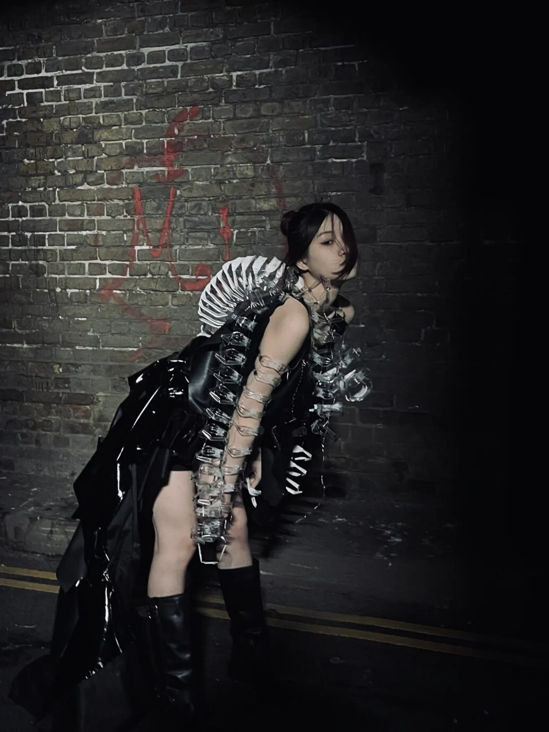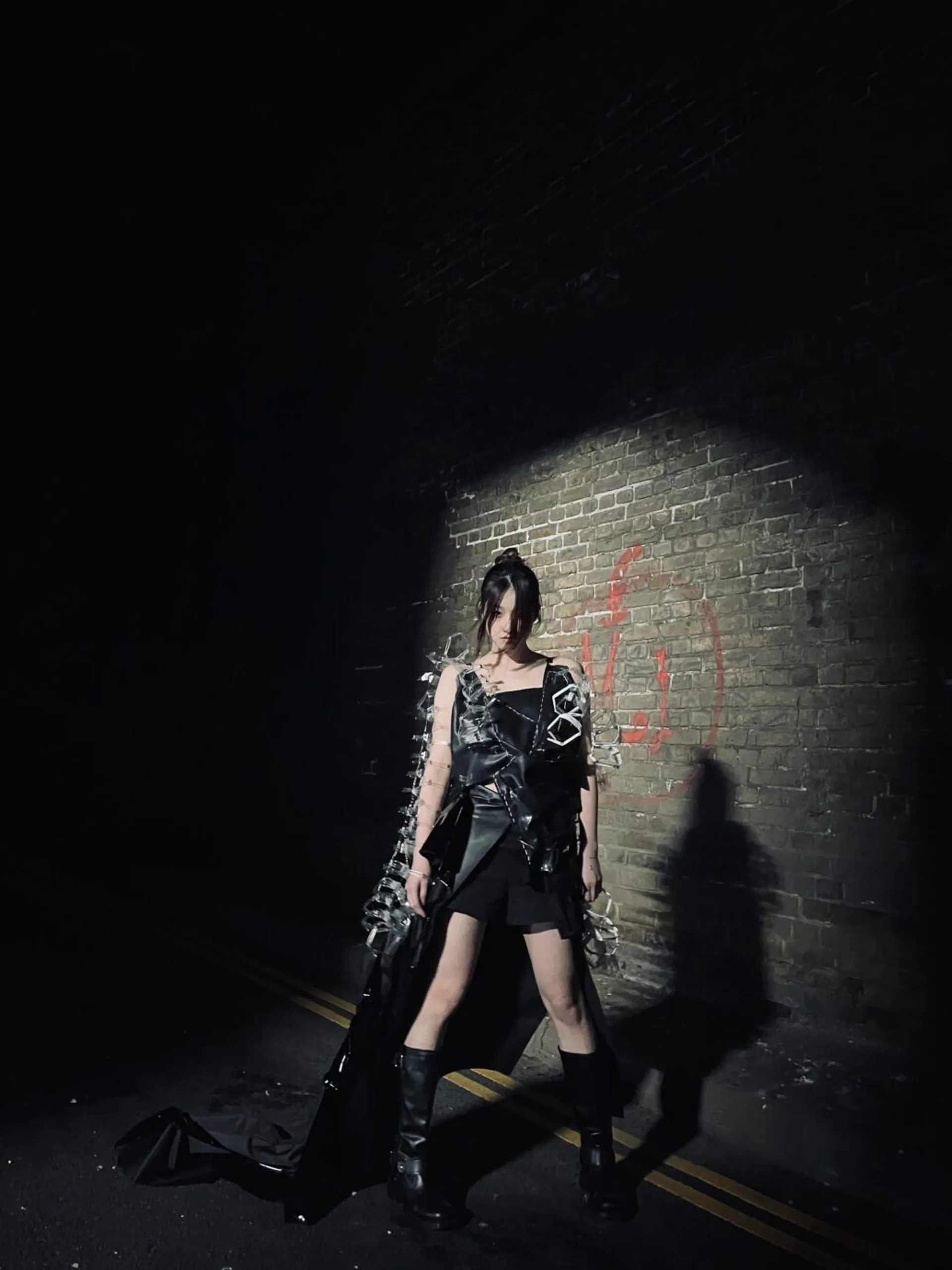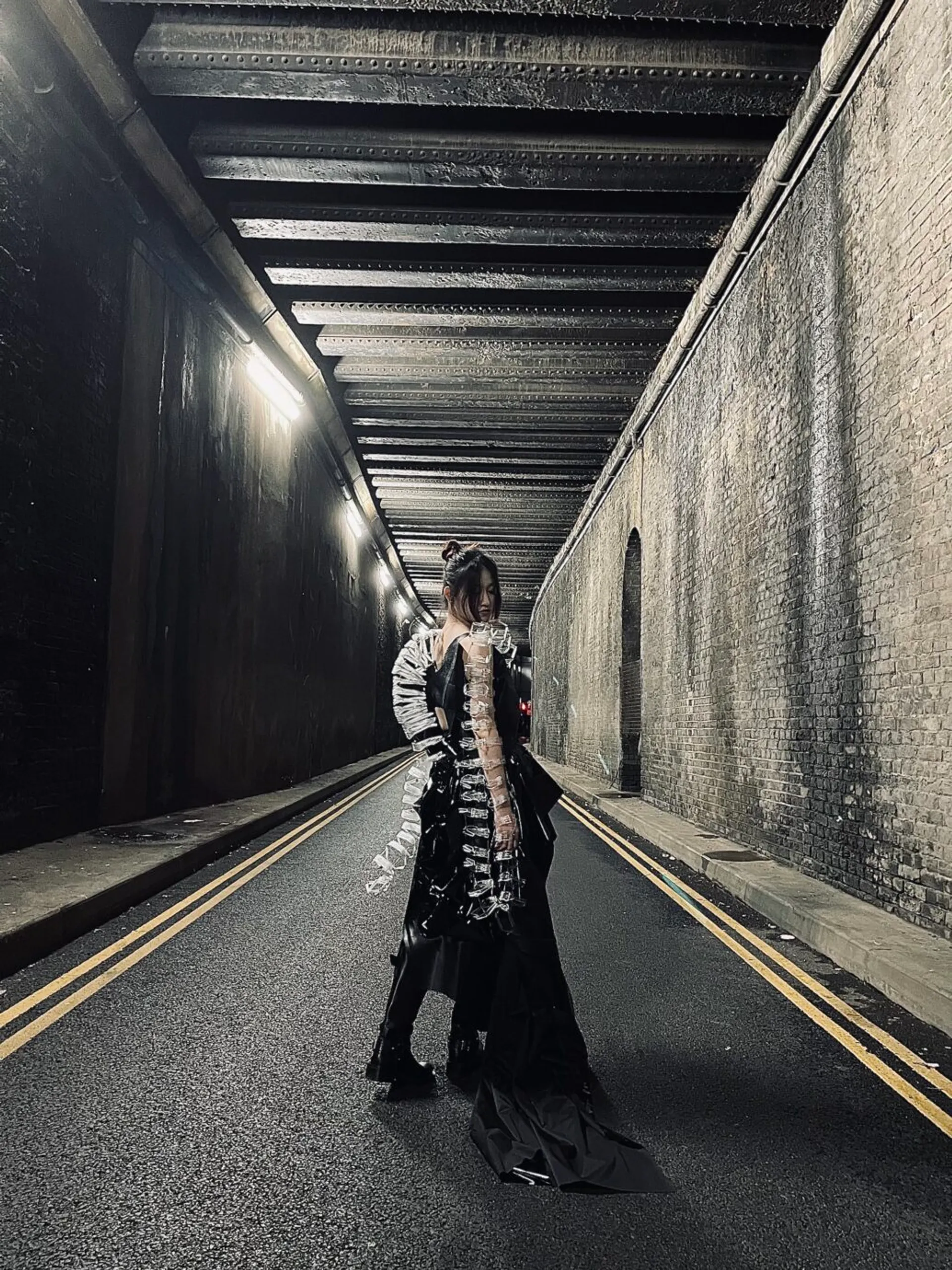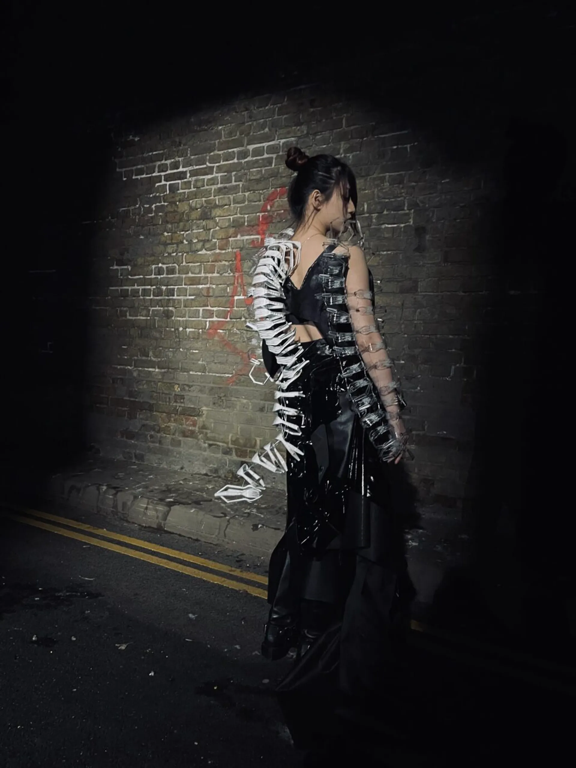 I explored a lot of different dystopian movies, trying to see what different kinds of futures have unique charms. Among them, “the matrix” fascinates me most. It is a movie I grew up with, and I really like the spy atmosphere in it as well as the very advanced special effects and plot at that time. Therefore, my skirt design is influenced to a large extent by the big windbreaker worn by the character in matrix. Self-protection was the emotion I felt most during the preliminary research. I always fantasize about how I would feel if I really went to the future, surrounded by AI and high-tech creations. I’m supposed to be panicked and insecure. So that was my inspiration for the exterior decoration.