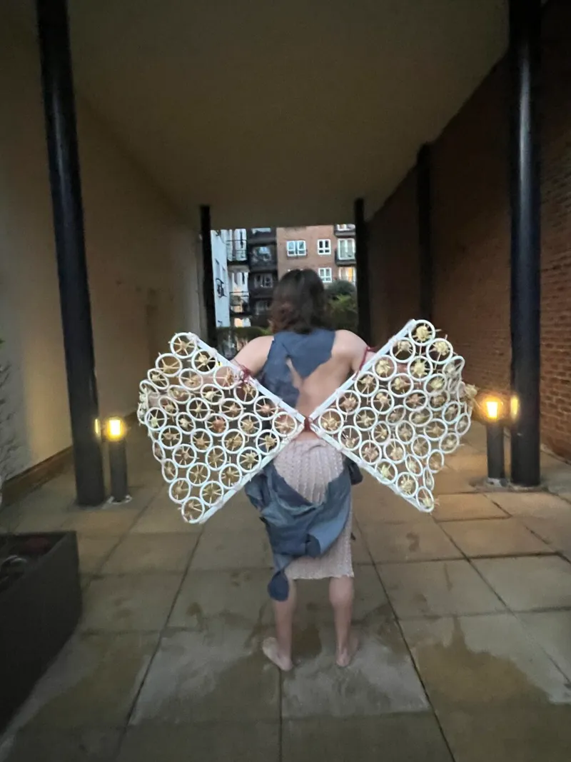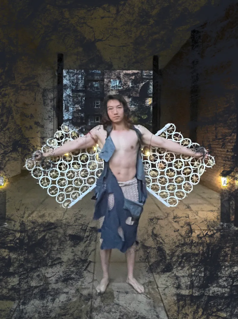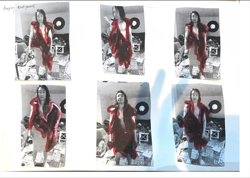 The name of my project is “Fu Di Mo,” and I started from a very early time to research the history of the ancient and the world about the strong and the older children in the family who sacrifice themselves to help others in the family. So I came up with the idea of knitting a skirt with the colors of ancient paintings. And the silhouette of the skirt is extracted from the skirts of people in the ancient Republic of China period. I feel sorry for them and I feel terrible for the brothers and sisters they help. Because the younger siblings who get help take it for granted, I think their relationship is like a white rose that’s open but dead. So I did a lot of fabric modifications with white roses and wilted roses. And I think their relationship is burning away like a piece of charred fabric. So I put my models in my burnt fabric on the top half. I used skewers and roses and rings for my clothes. The ring is their relationship, and the skewer is their hurt. I let my model wear my clothes and wear my device to represent his redemption. My models are like younger siblings who take too much from their families.