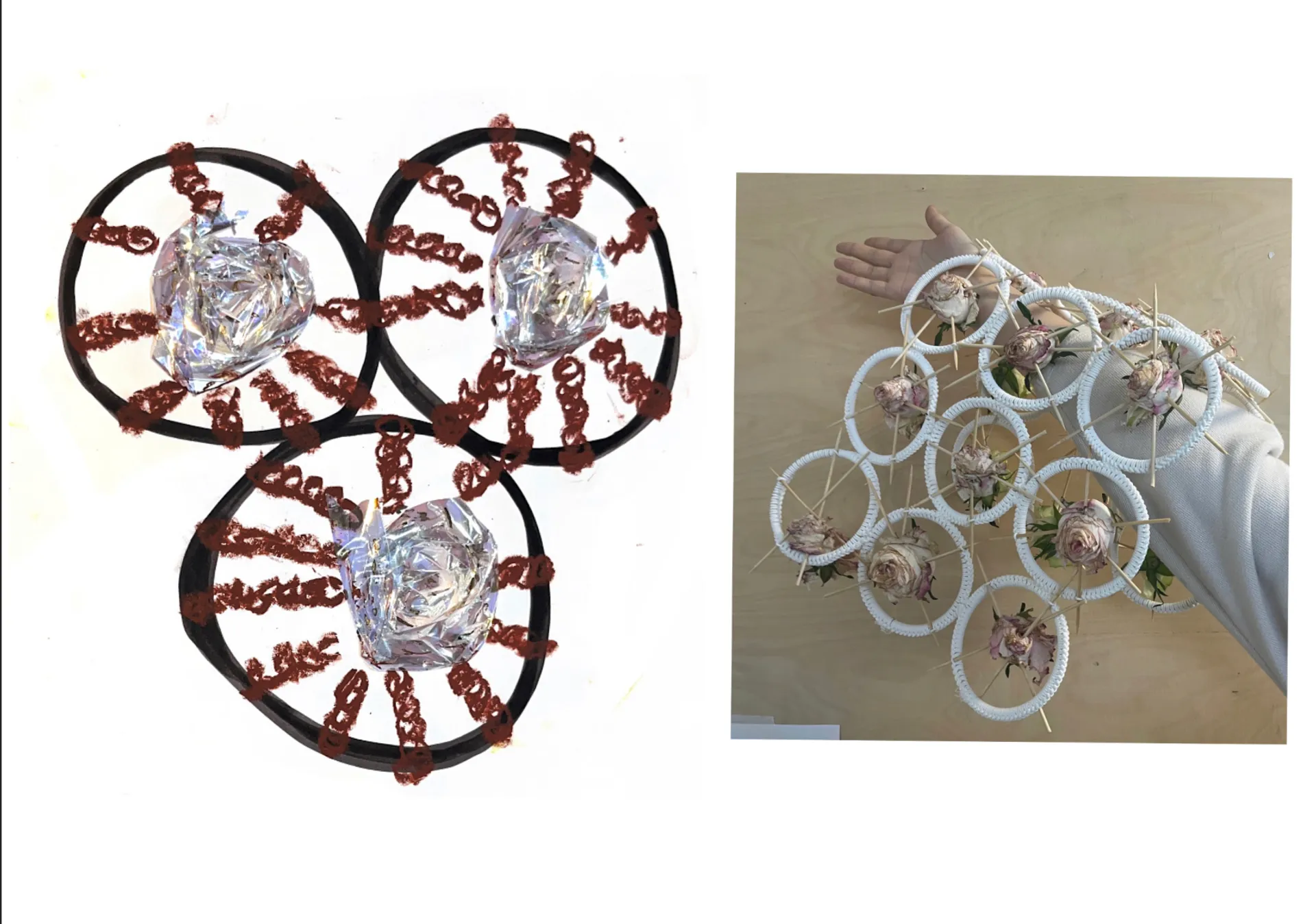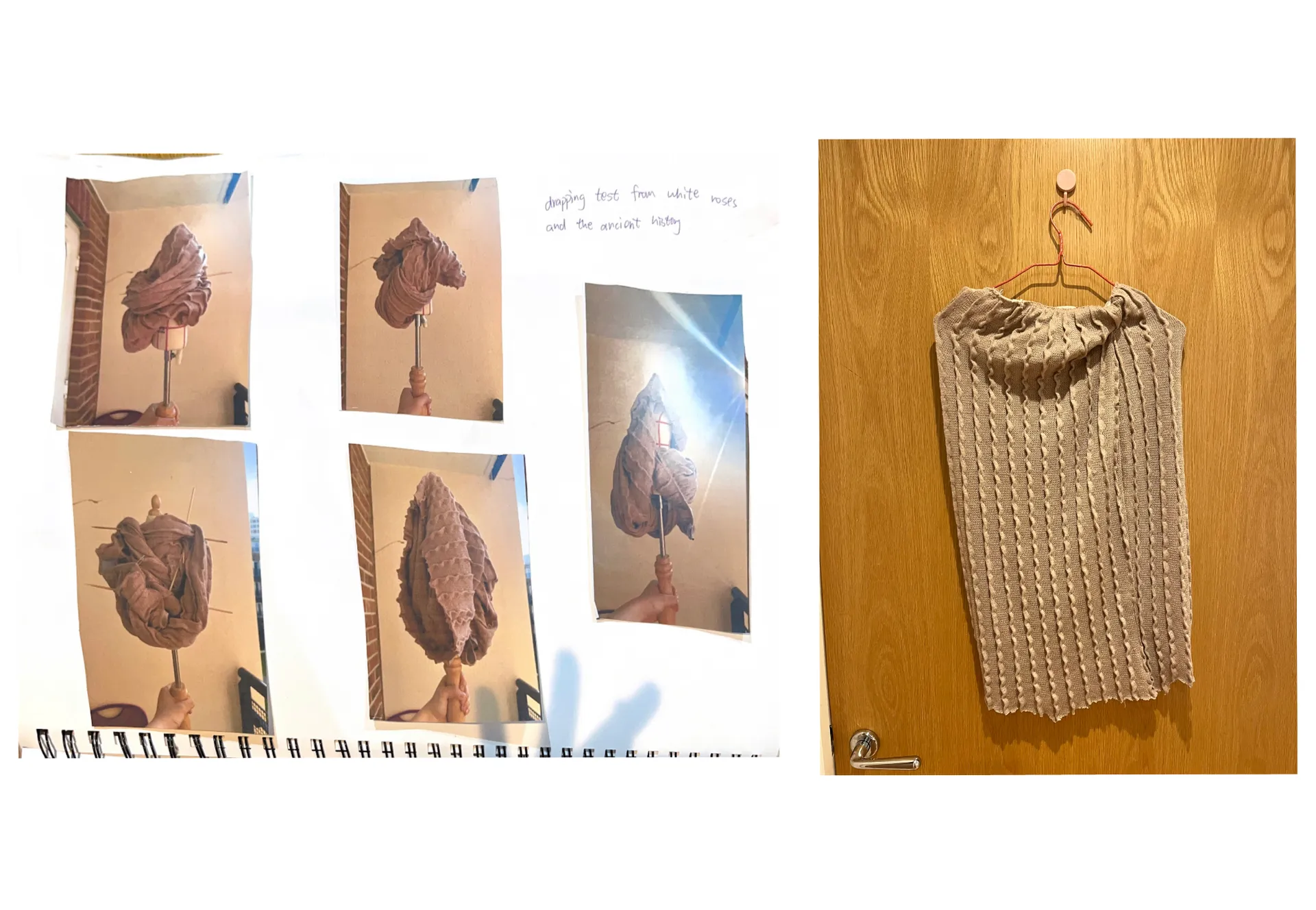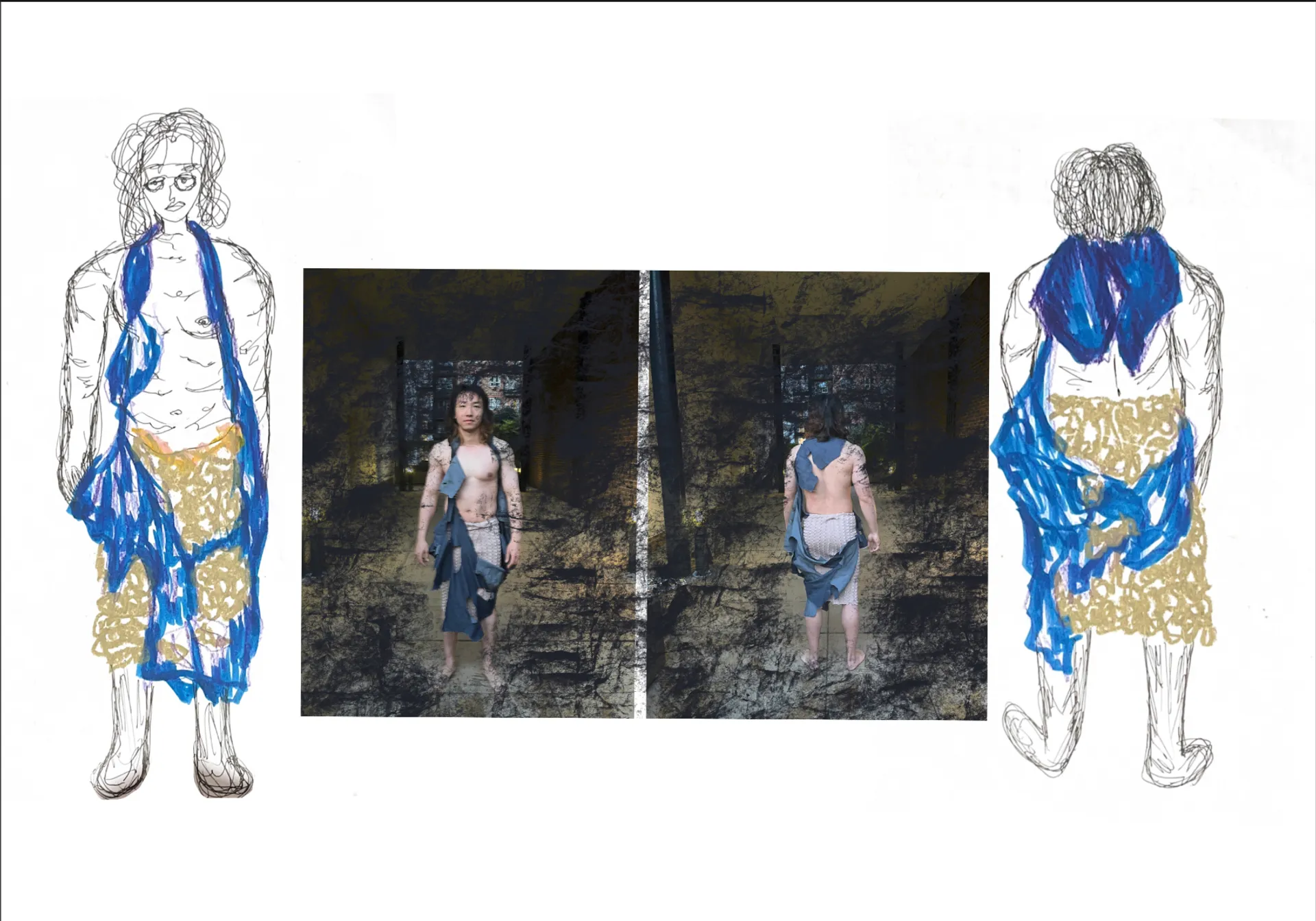 The name of my project is “Fu Di Mo,” and I started from a very early time to research the history of the ancient and the world about the strong and the older children in the family who sacrifice themselves to help others in the family. So I came up with the idea of knitting a skirt with the colors of ancient paintings. And the silhouette of the skirt is extracted from the skirts of people in the ancient Republic of China period. I feel sorry for them and I feel terrible for the brothers and sisters they help. Because the younger siblings who get help take it for granted, I think their relationship is like a white rose that’s open but dead. So I did a lot of fabric modifications with white roses and wilted roses. And I think their relationship is burning away like a piece of charred fabric. So I put my models in my burnt fabric on the top half. I used skewers and roses and rings for my clothes. The ring is their relationship, and the skewer is their hurt. I let my model wear my clothes and wear my device to represent his redemption. My models are like younger siblings who take too much from their families.