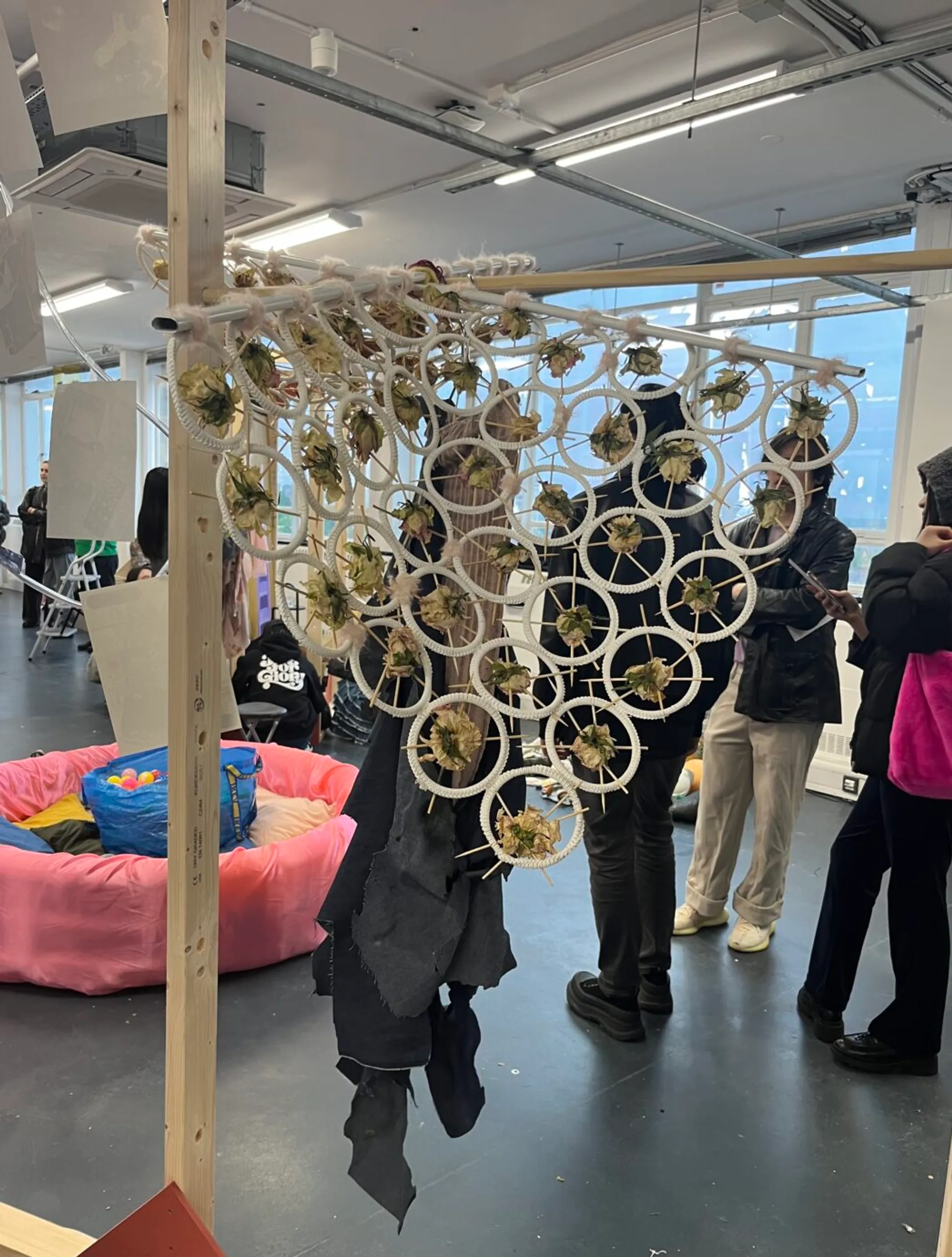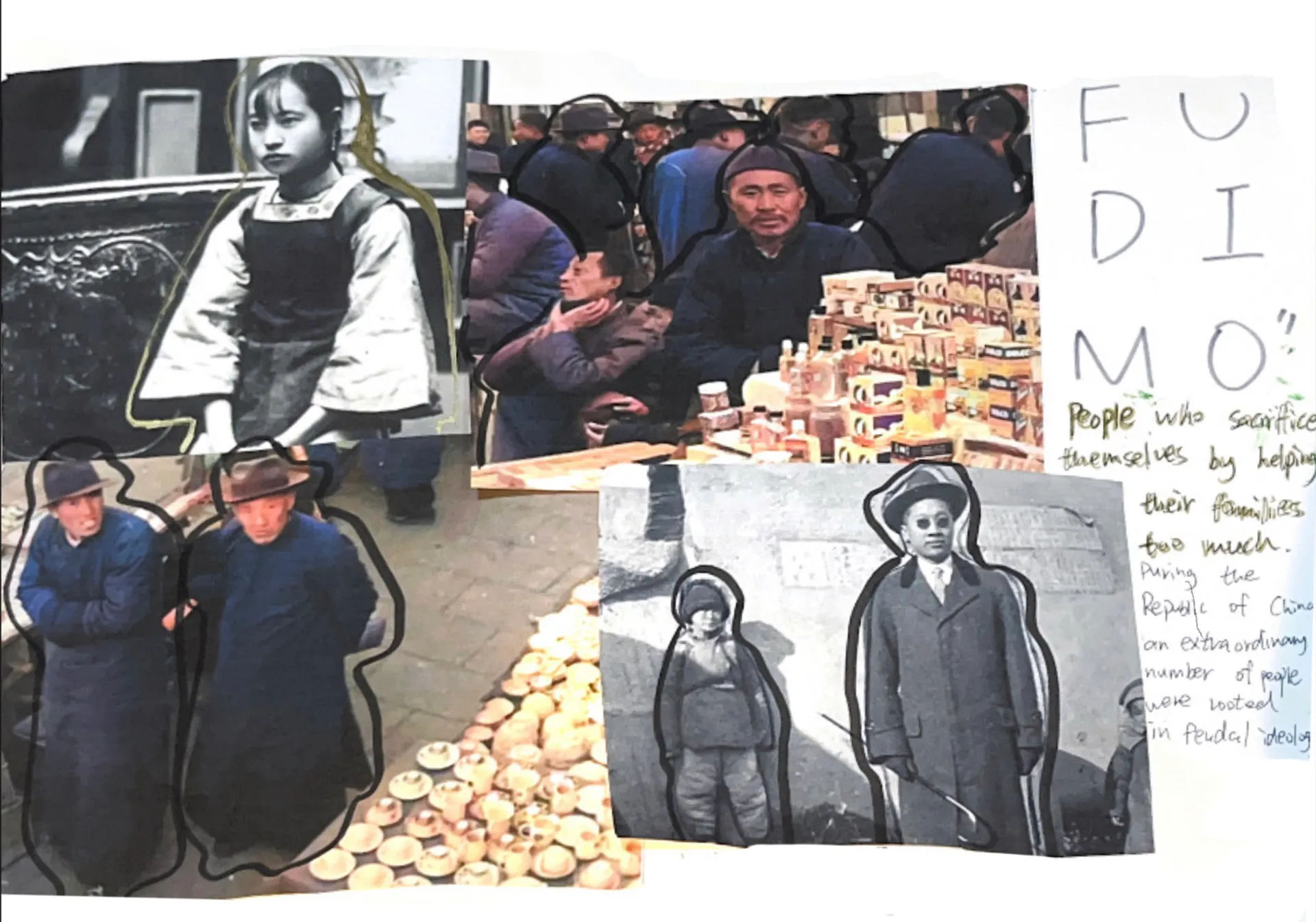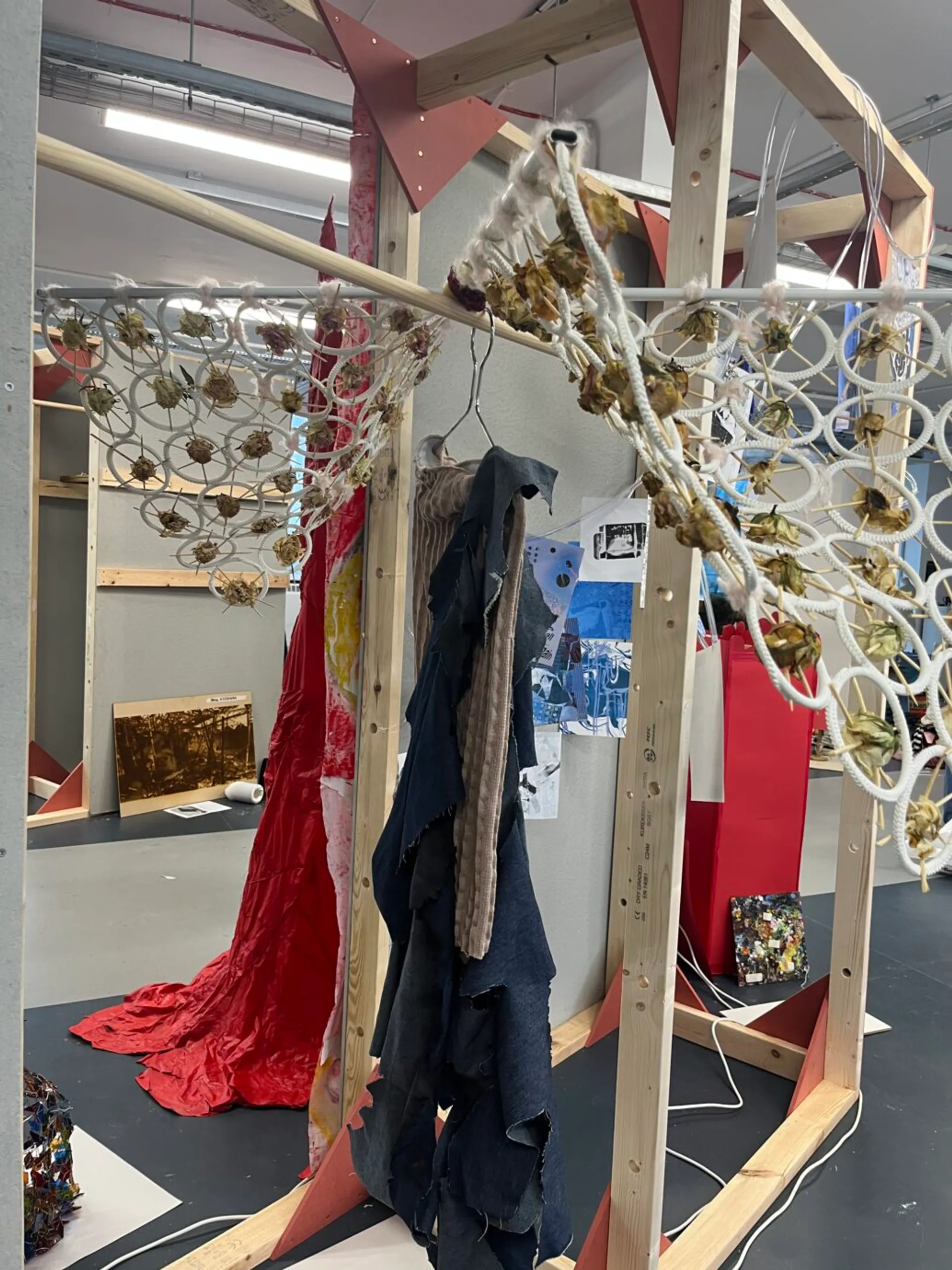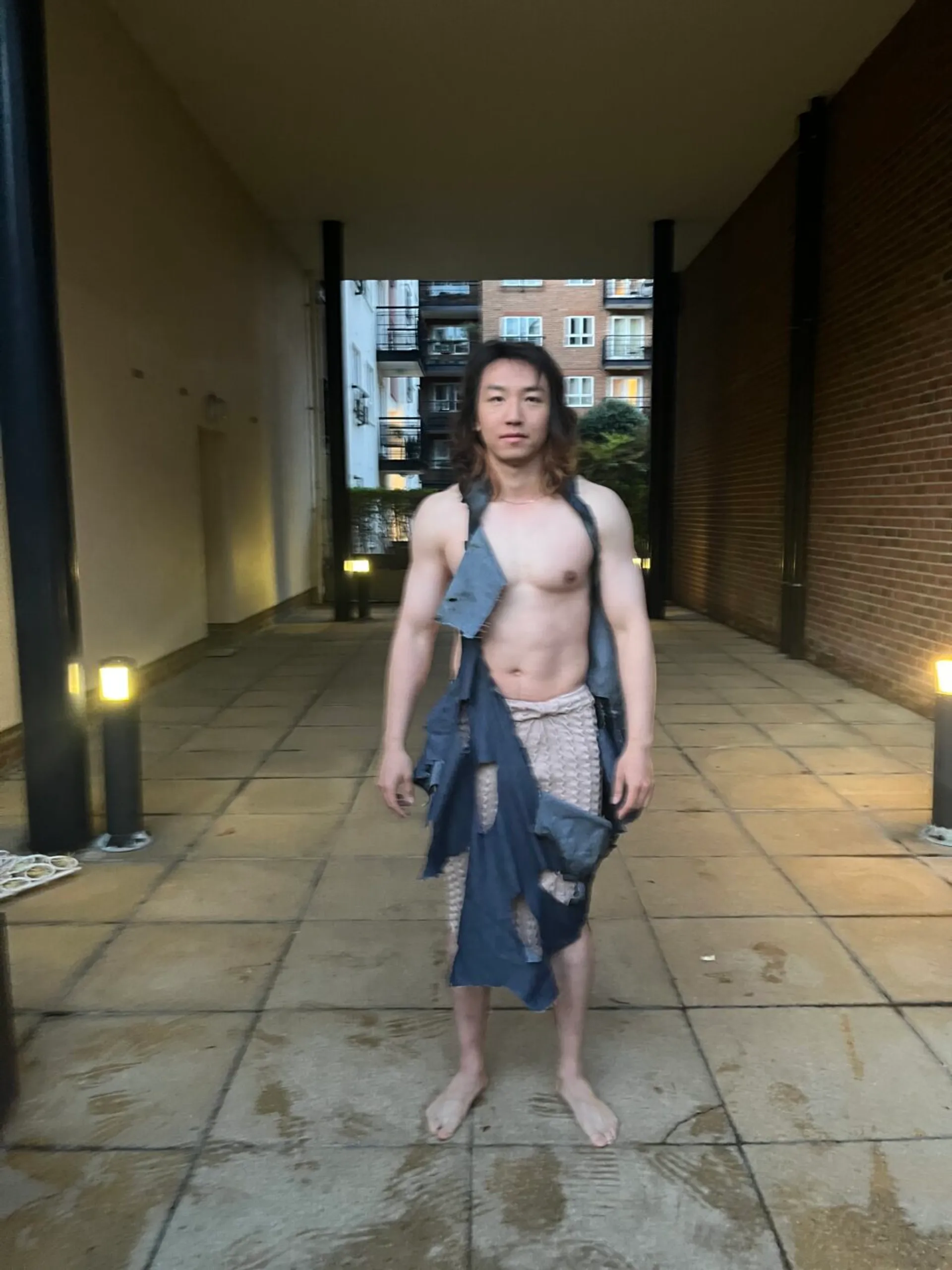 The name of my project is “Fu Di Mo,” and I started from a very early time to research the history of the ancient and the world about the strong and the older children in the family who sacrifice themselves to help others in the family. So I came up with the idea of knitting a skirt with the colors of ancient paintings. And the silhouette of the skirt is extracted from the skirts of people in the ancient Republic of China period. I feel sorry for them and I feel terrible for the brothers and sisters they help. Because the younger siblings who get help take it for granted, I think their relationship is like a white rose that’s open but dead. So I did a lot of fabric modifications with white roses and wilted roses. And I think their relationship is burning away like a piece of charred fabric. So I put my models in my burnt fabric on the top half. I used skewers and roses and rings for my clothes. The ring is their relationship, and the skewer is their hurt. I let my model wear my clothes and wear my device to represent his redemption. My models are like younger siblings who take too much from their families.