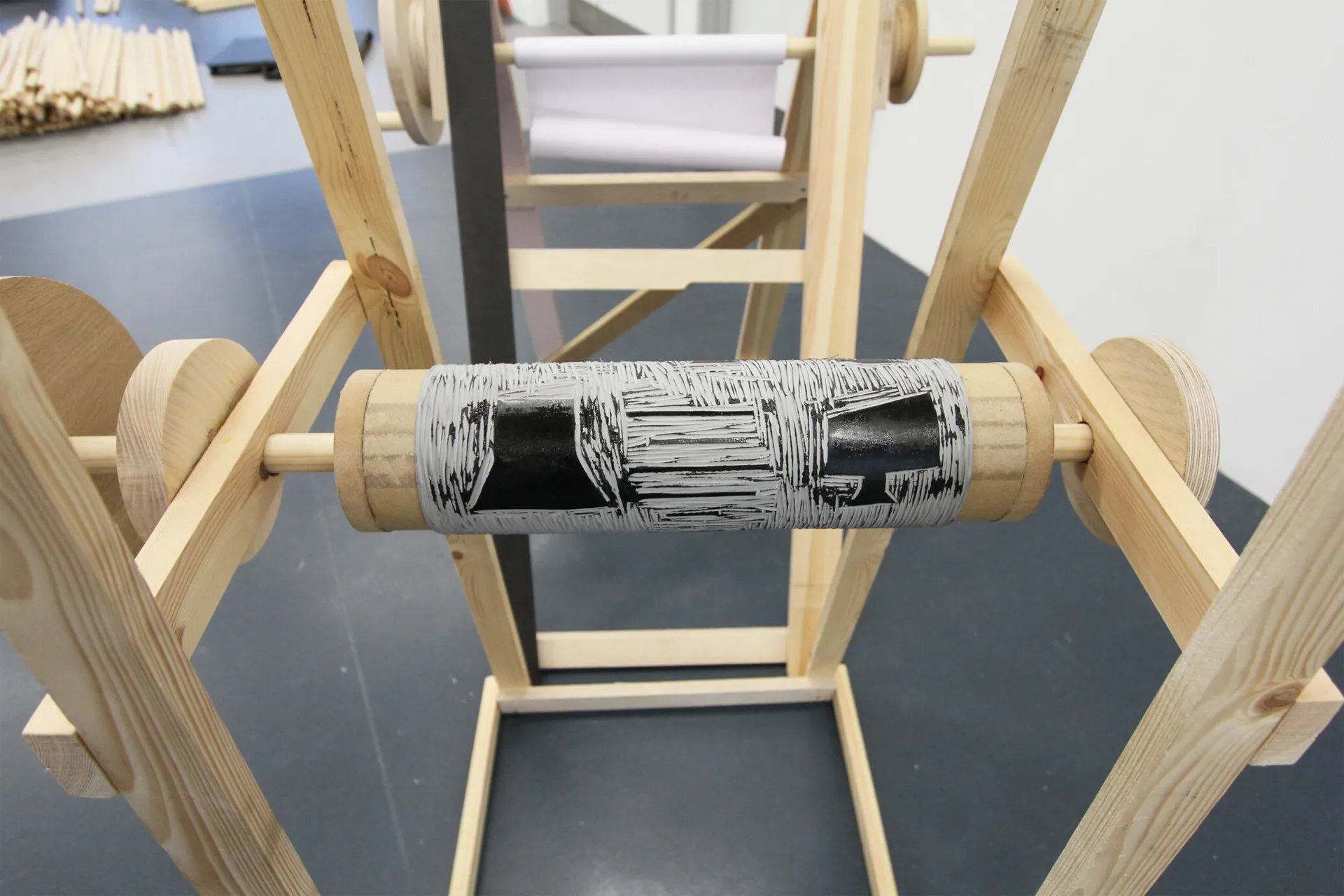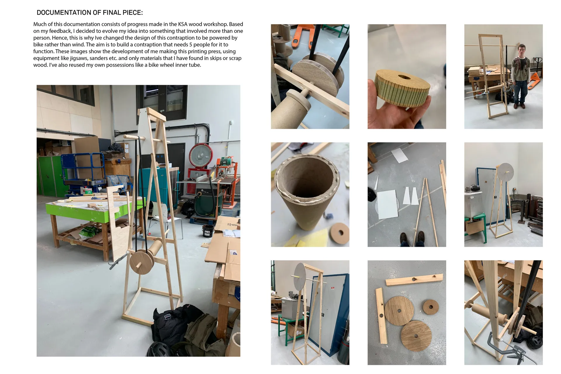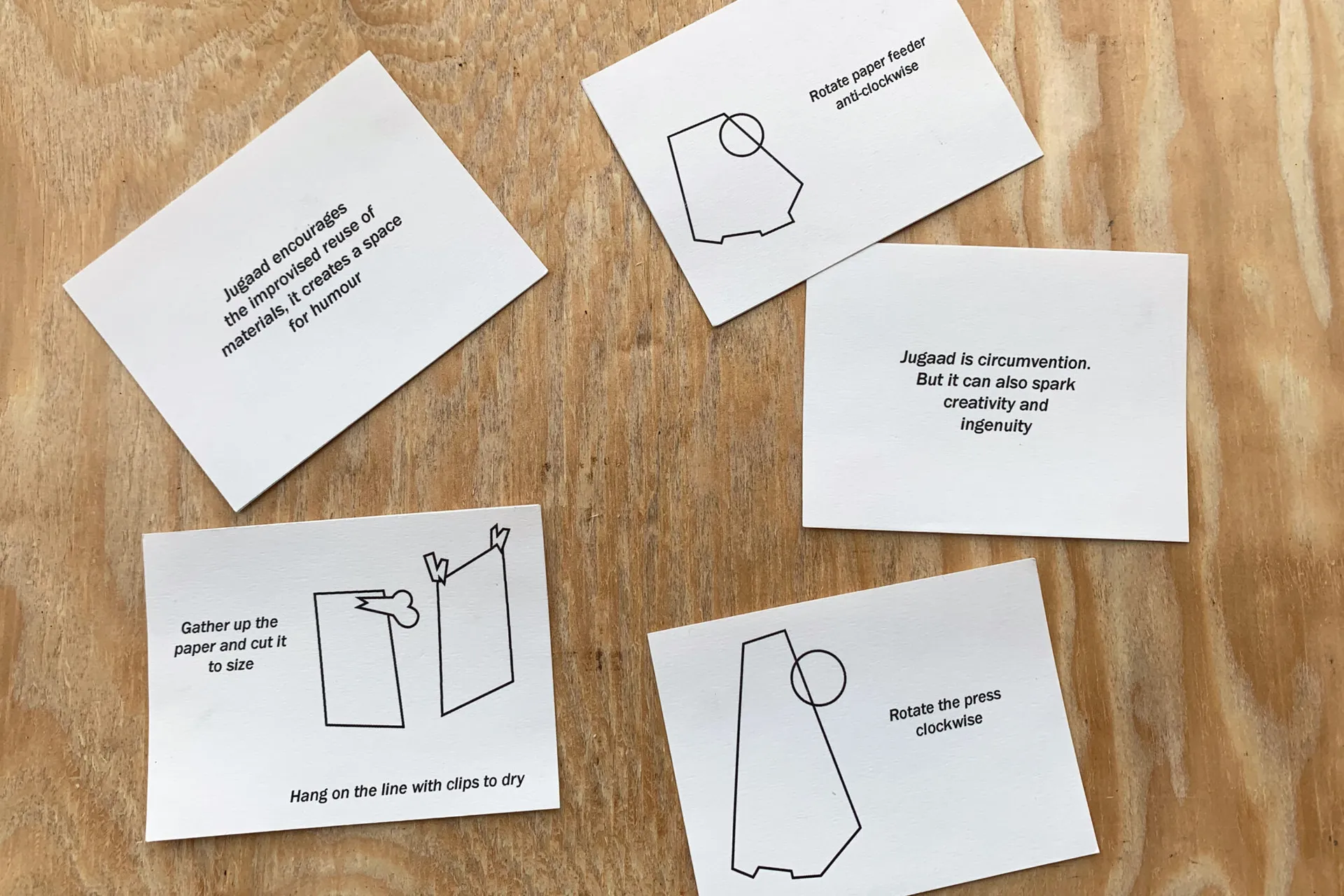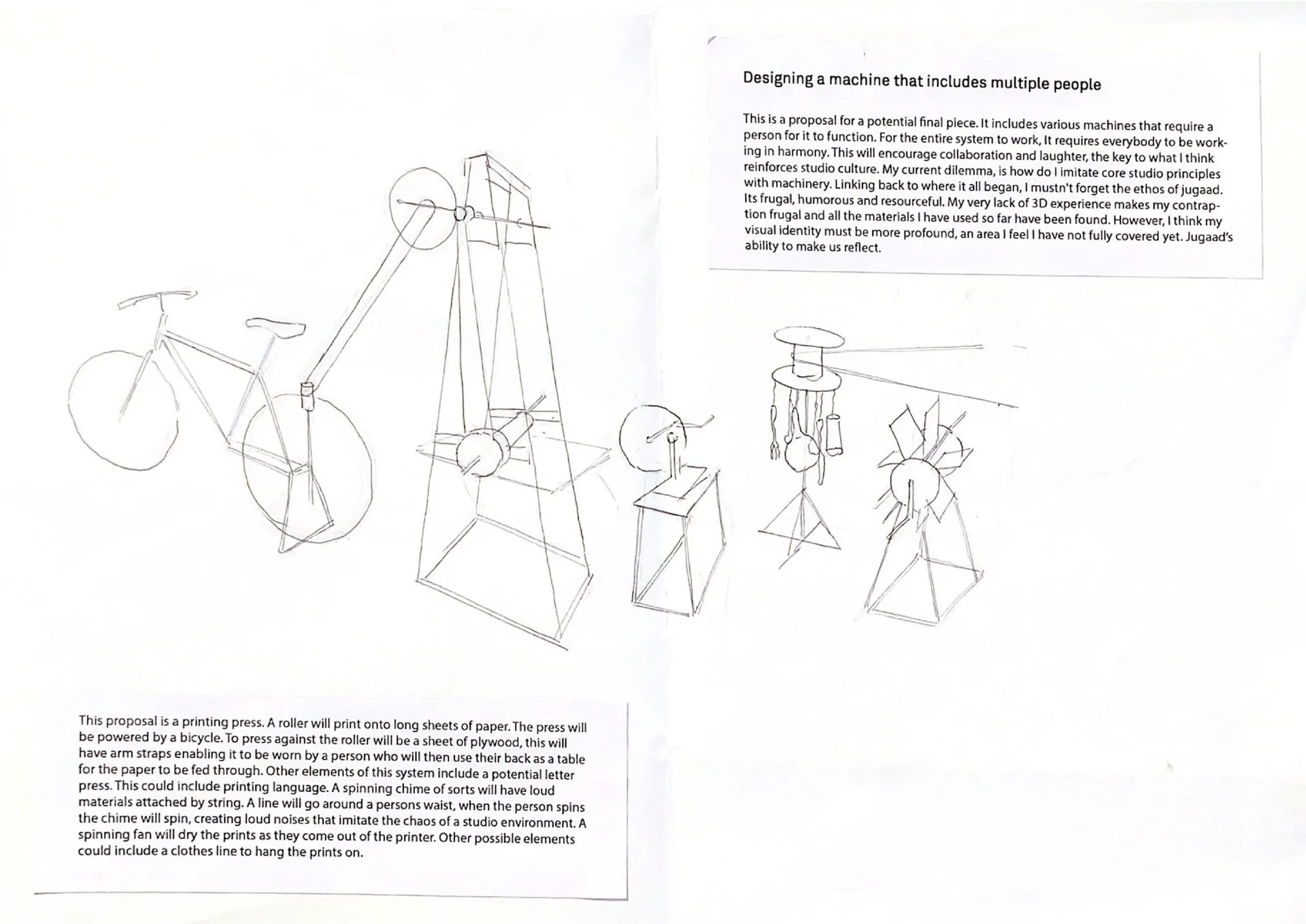 I am proposing this printing press as an opportunity to reflect on our own realities. This contraption is set to be used in a future studio setting where the ideas around studio culture are ever changing. In this speculation, the need for human intervention and tradition has been economised as technology becomes a framework of which we find ourselves trying to navigate. Awareness around processes and self-sufficiency becomes cloudy. This printing press encourages collaboration and restores a common philosophy within a studio space. Most efficient with five people, it requires a collegiate force for it to function. The recycling of materials encourage us to be environmentally conscious. The frugal, unpolished nature of the contraption fosters humour. Jugaad highlights dilemmas and actively seeks for alternatives. Not a ‘better’ way, just another way.