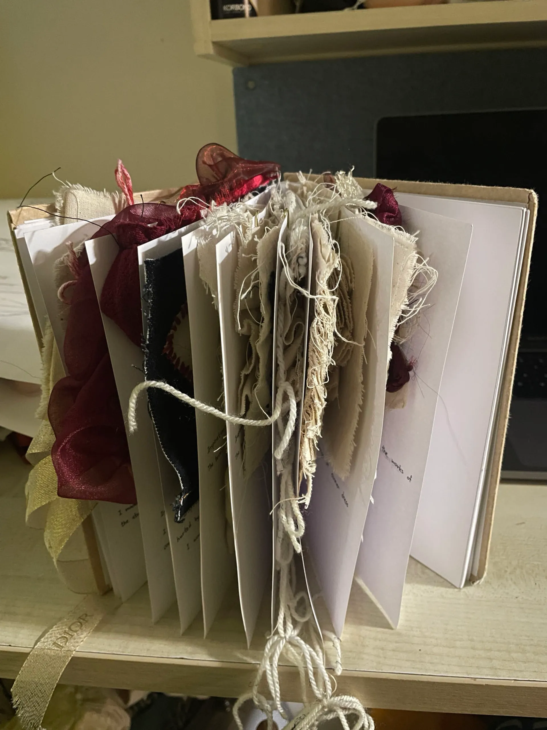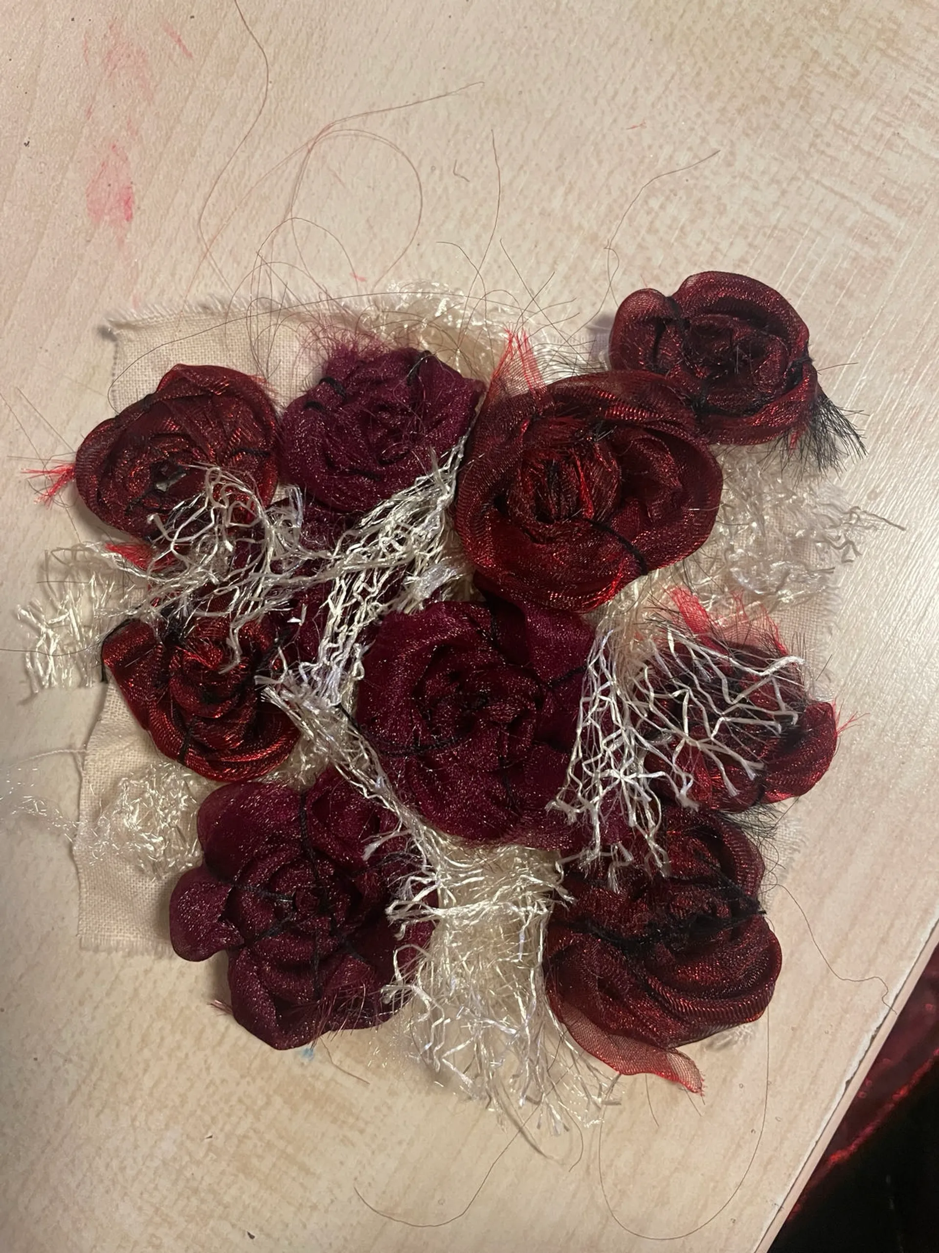 These are my testing and development images. I made the hip-pad by using metal boning and tape. The reason why I made hip-pad because of Marie Antoinette wore hip-pad rather than other types of bustle, she was the person who influenced the fashion trend in 1789. There were some textile sample for making the fabric more textured.