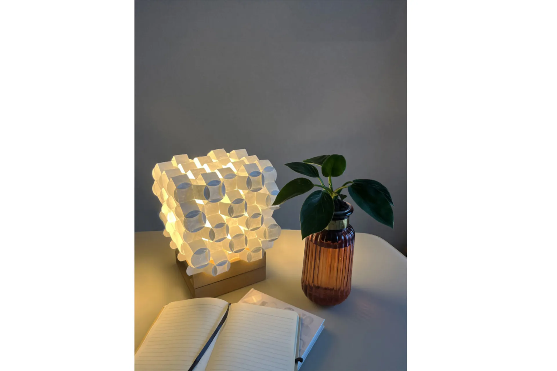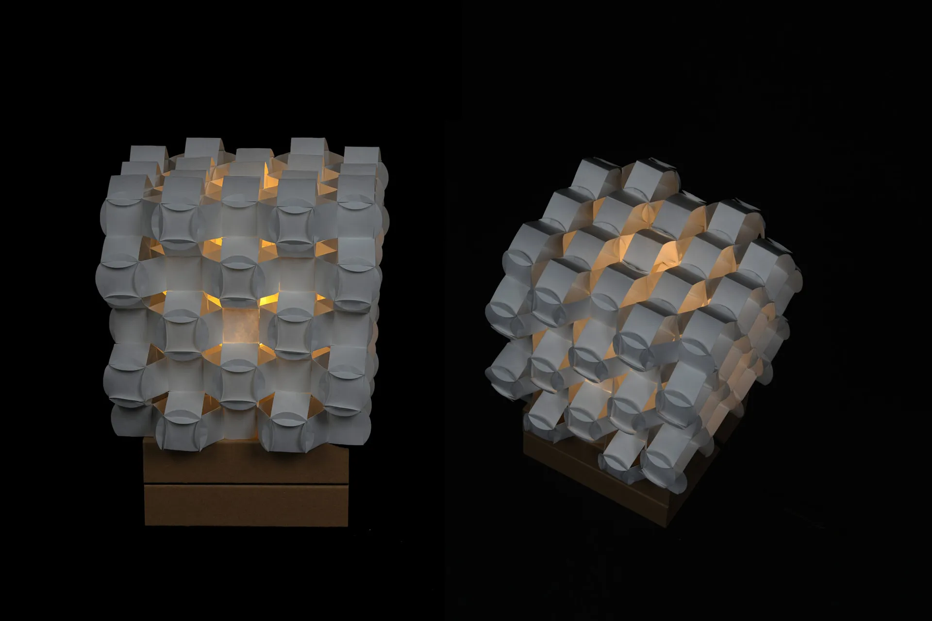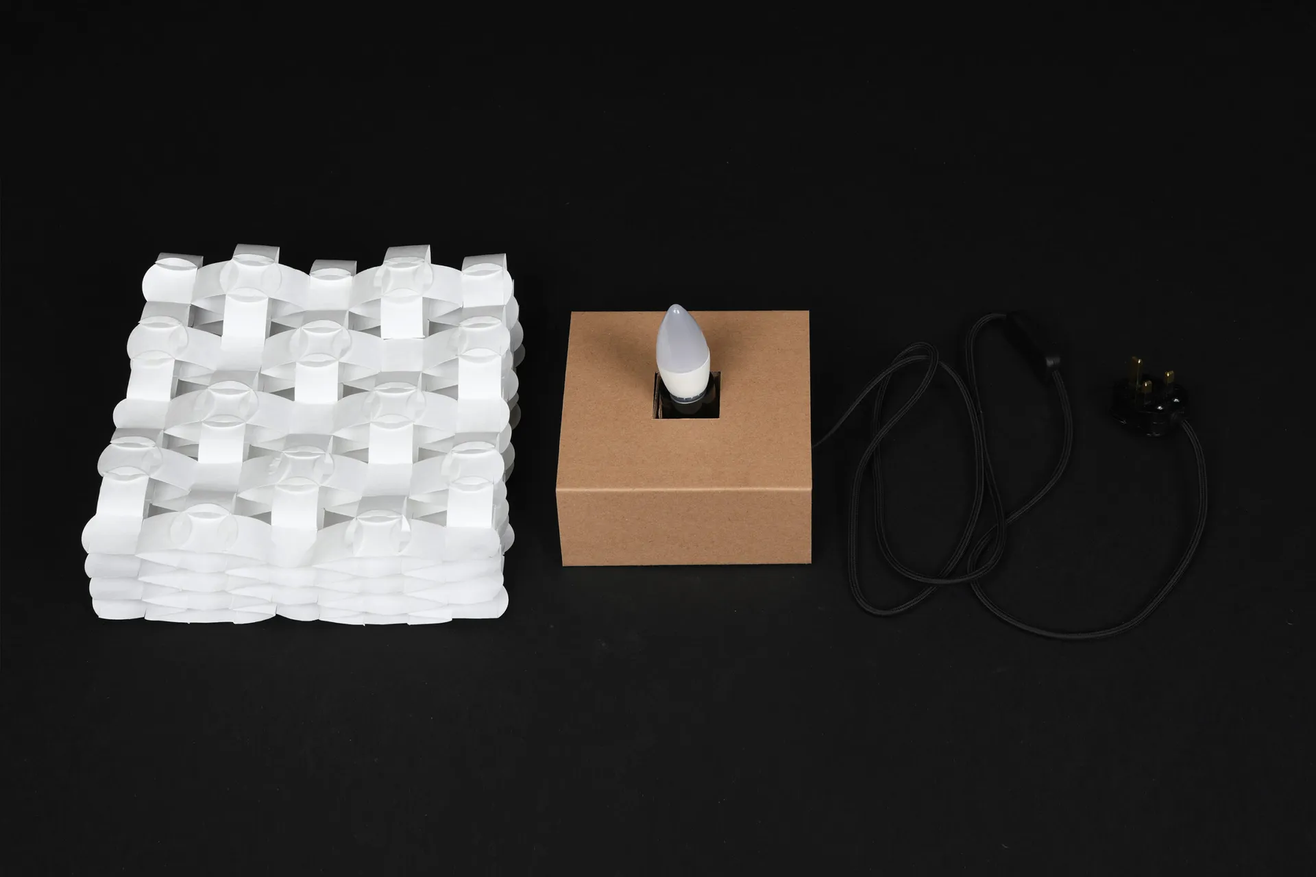The project’s outcome – ‘PRESS LAMP’ is made of Dupont Tyvek. The lampshade is foldable, making it convenient for storage. The base is constructed from cardboard and serves as the packaging. Both components are digitally cut and are self-assembly.