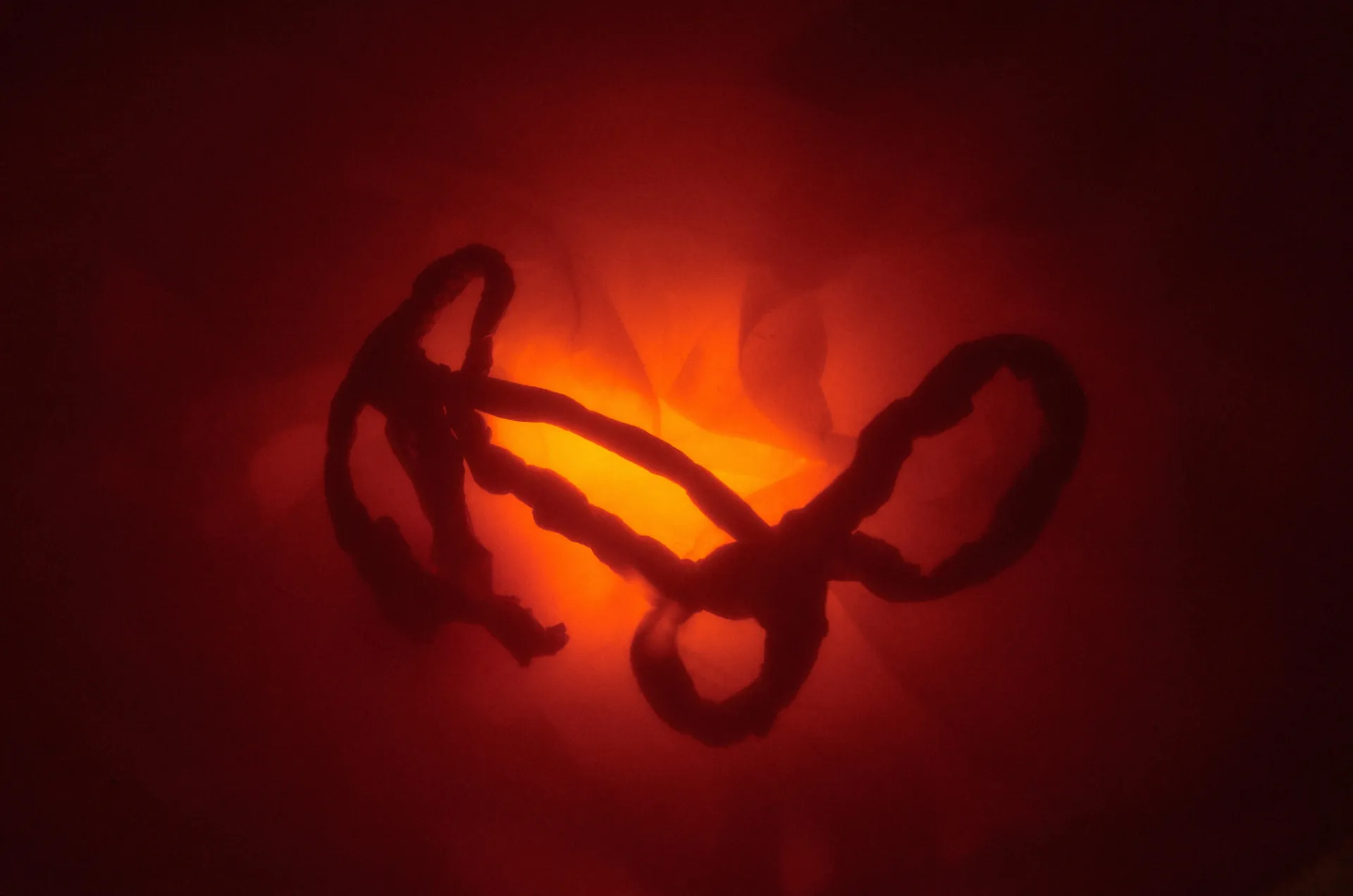 该项目旨在描述怀孕期间与母亲之间的共生关系。这种关系的特点是相互依赖和斗争。作品整体风格抽象、模糊。通过模拟血液流经的皮肤表皮环境,并使用不同的材料,如绞线、纸条等,营造出脐带缠绕在子宫周围的场景。脐带被描述为徘徊在子宫周围,作为连接间接和母亲的直接物理通道,强调了这种共生关系的本质。作品的重点不是母亲的具体形象,却表达了母亲与母亲的关系,这符合抽象表现主义的风格。