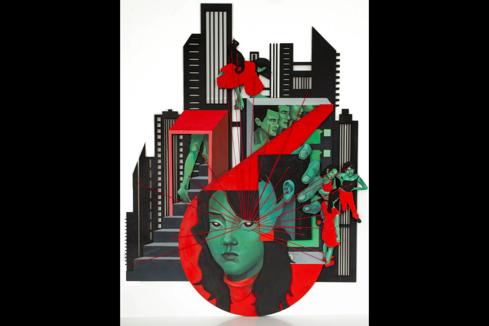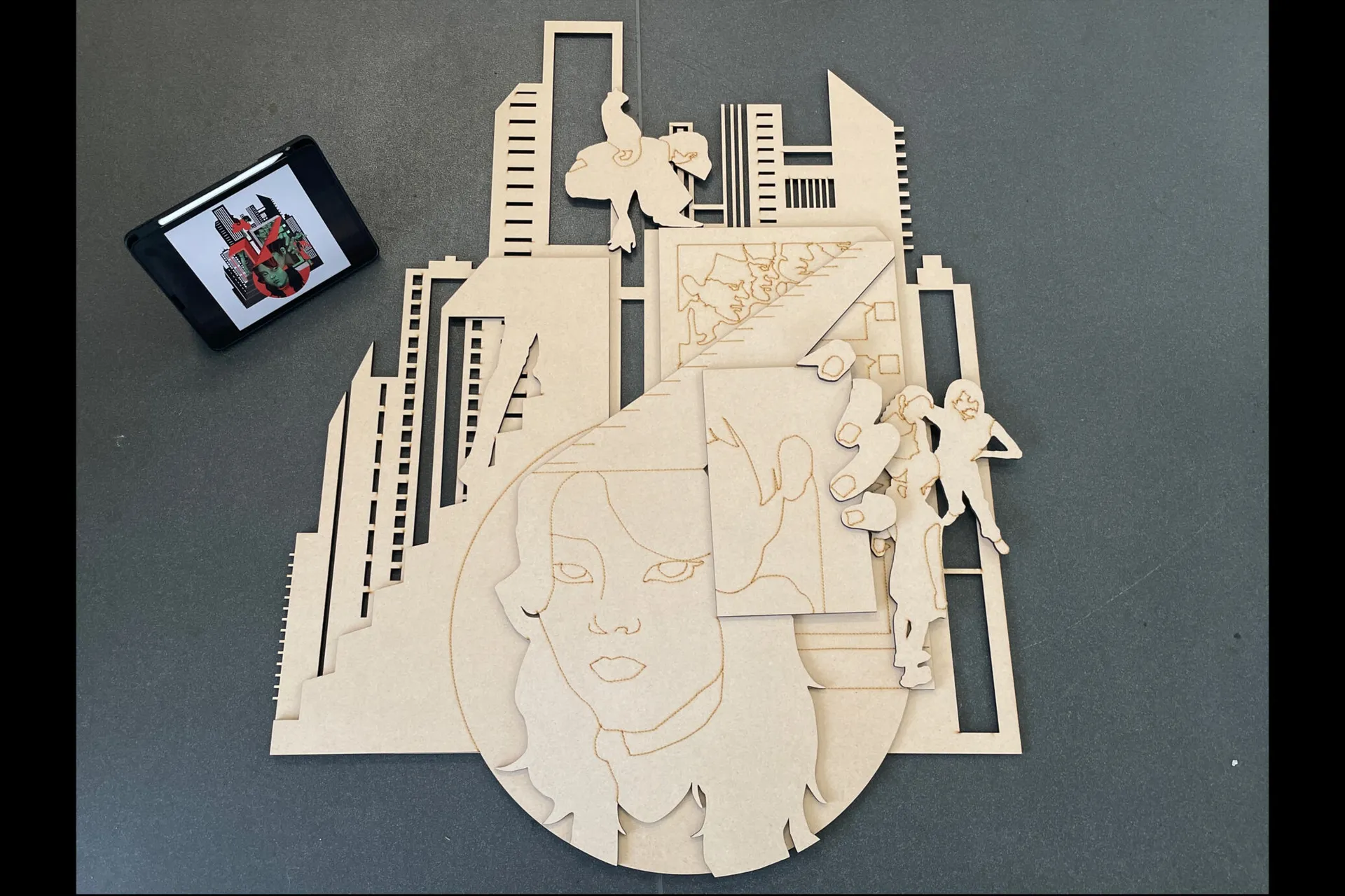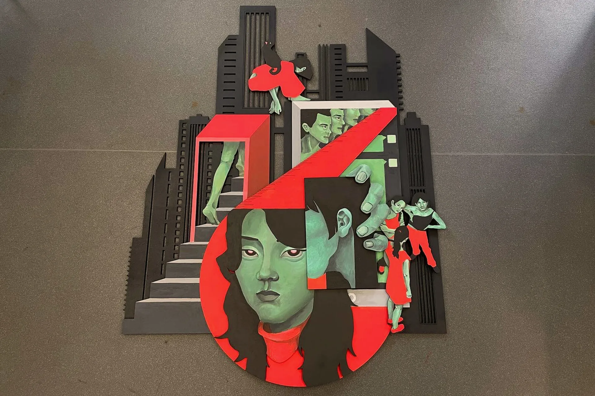 “Connection” is a wooden board painting of human relationships. It consists of seven wooden panels. The central figure in the image is me, and the left side represents my inner world, while the right side represents my external connections or social network. The black silhouette of the city in the background represents society, which carries human connections. The red line connecting me to the various elements in the image symbolizes the connection between me and those elements.