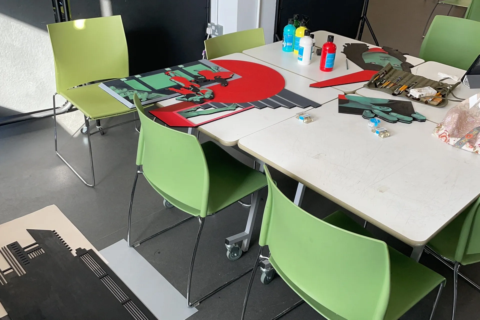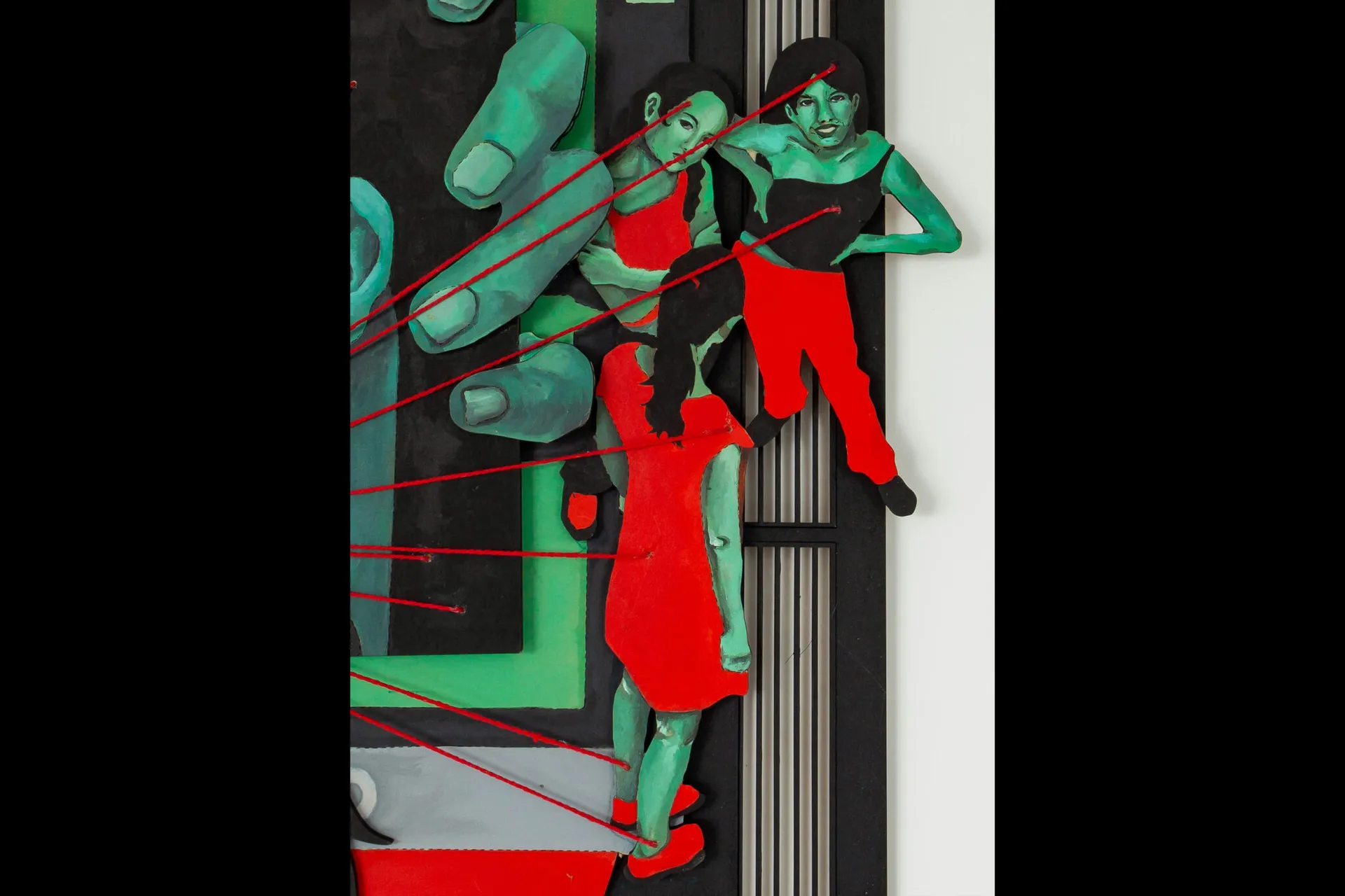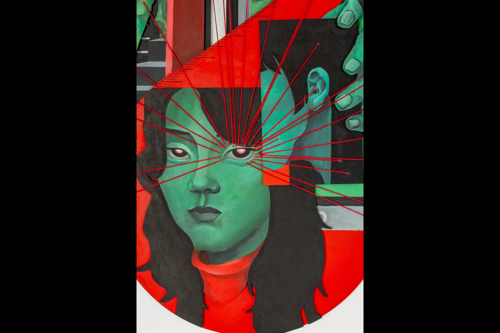 “Connection” is a wooden board painting of human relationships. It consists of seven wooden panels. The central figure in the image is me, and the left side represents my inner world, while the right side represents my external connections or social network. The black silhouette of the city in the background represents society, which carries human connections. The red line connecting me to the various elements in the image symbolizes the connection between me and those elements.
