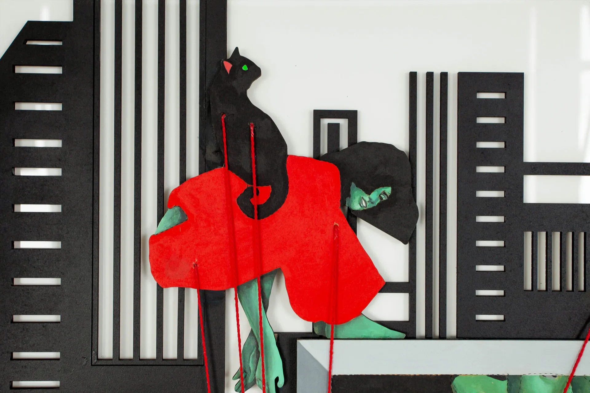 The left half of the picture represents my inner world, which is a private domain. The staircase and red door frame represent the threshold to enter my inner world, which connects to all things in the world, such as animals, toys, and objects. The countless red lines in the image represent the diverse emotional connections that humans have with each other, connecting independent individuals and weaving them into the social network of human society.