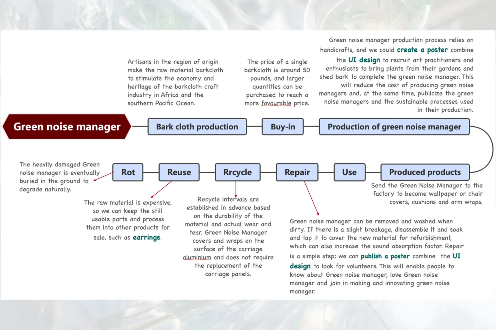 Green noise manager is a green,sustainable,innovative acoustic fabric made from bark fabric.It has a better sound absorption coefficient than traditional acoustic cotton and is biodegradable and sustainable.It solves the problem of lack of fashion and market potential of the raw material barkcloth. It stimulates the craft industry’s economy and inheritance of the barkcloth’s origin.At the same time,it is improving the sound absorption coefficient through the sustainable process.