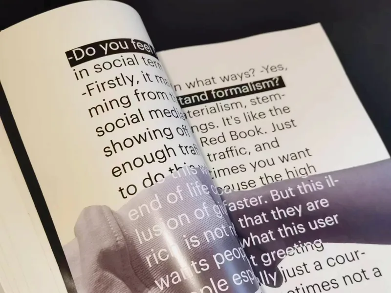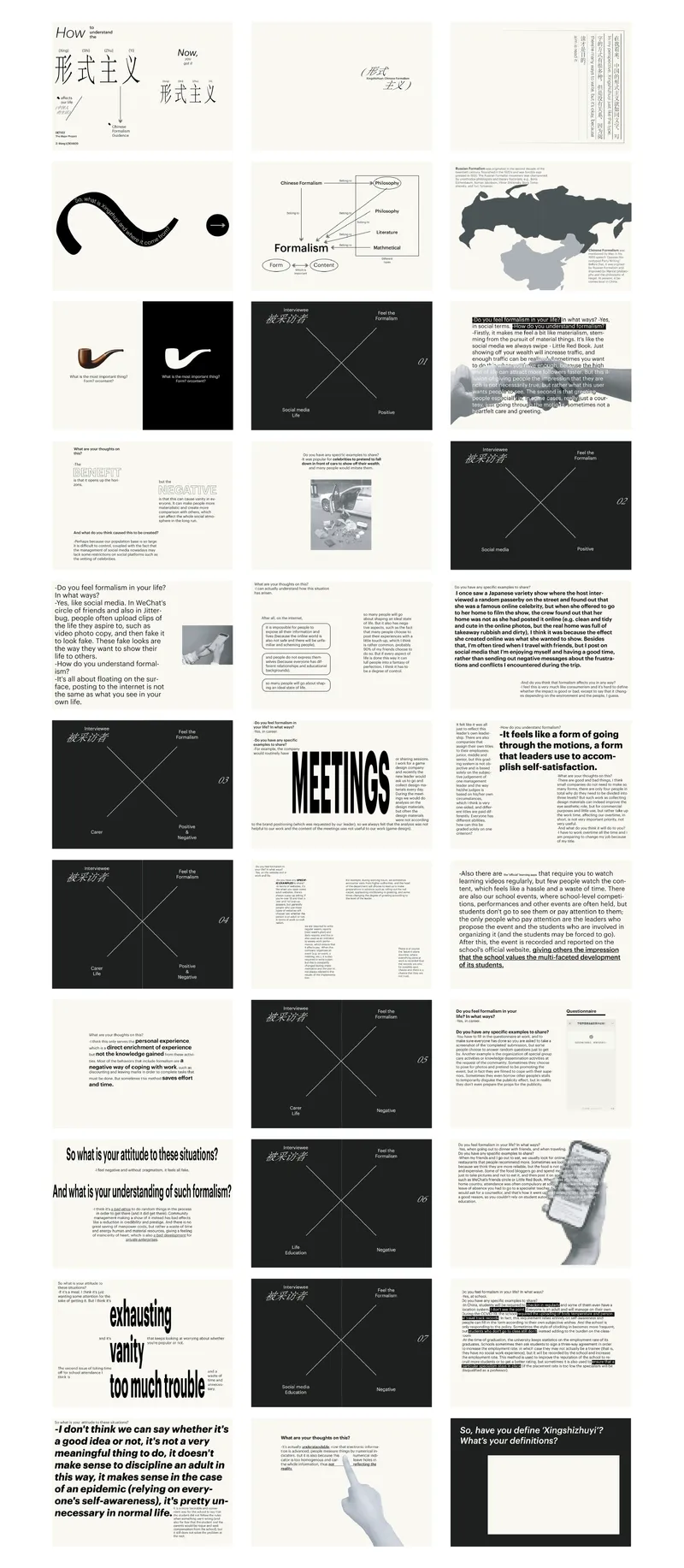 I’m discussing whether this ‘Xingshizhuyi’ is negative or positive through this book. And helps the reader understand how this thought of Xingshizhuyi influences us(Chinese or someone who has experience in China) to consider the ‘form’ in our life. The typography of the content is a ‘form’ in itself, and I prefer to present the ‘content’ here in a more straightforward way. Even though the interviewees in the book have different educational backgrounds and life experiences, they all have varying impressions of Xingshizhuyi. As in the society we live in, the negative impact of Xingshizhuyi on our lives is actively discussed, but sometimes it has to be admitted as part of the society we live in.