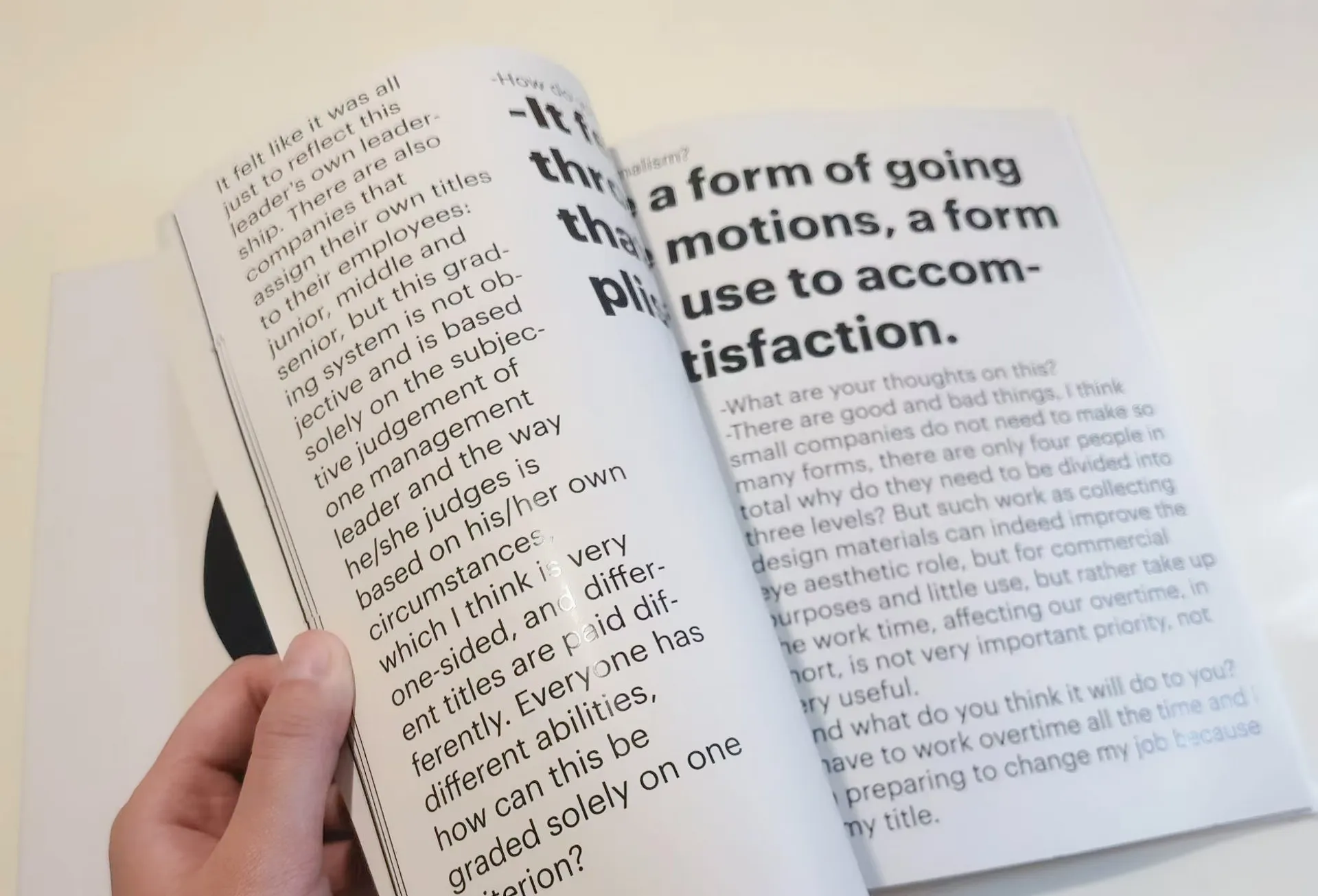 I’m discussing whether this ‘Xingshizhuyi’ is negative or positive through this book. And helps the reader understand how this thought of Xingshizhuyi influences us(Chinese or someone who has experience in China) to consider the ‘form’ in our life. The typography of the content is a ‘form’ in itself, and I prefer to present the ‘content’ here in a more straightforward way. Even though the interviewees in the book have different educational backgrounds and life experiences, they all have varying impressions of Xingshizhuyi. As in the society we live in, the negative impact of Xingshizhuyi on our lives is actively discussed, but sometimes it has to be admitted as part of the society we live in.