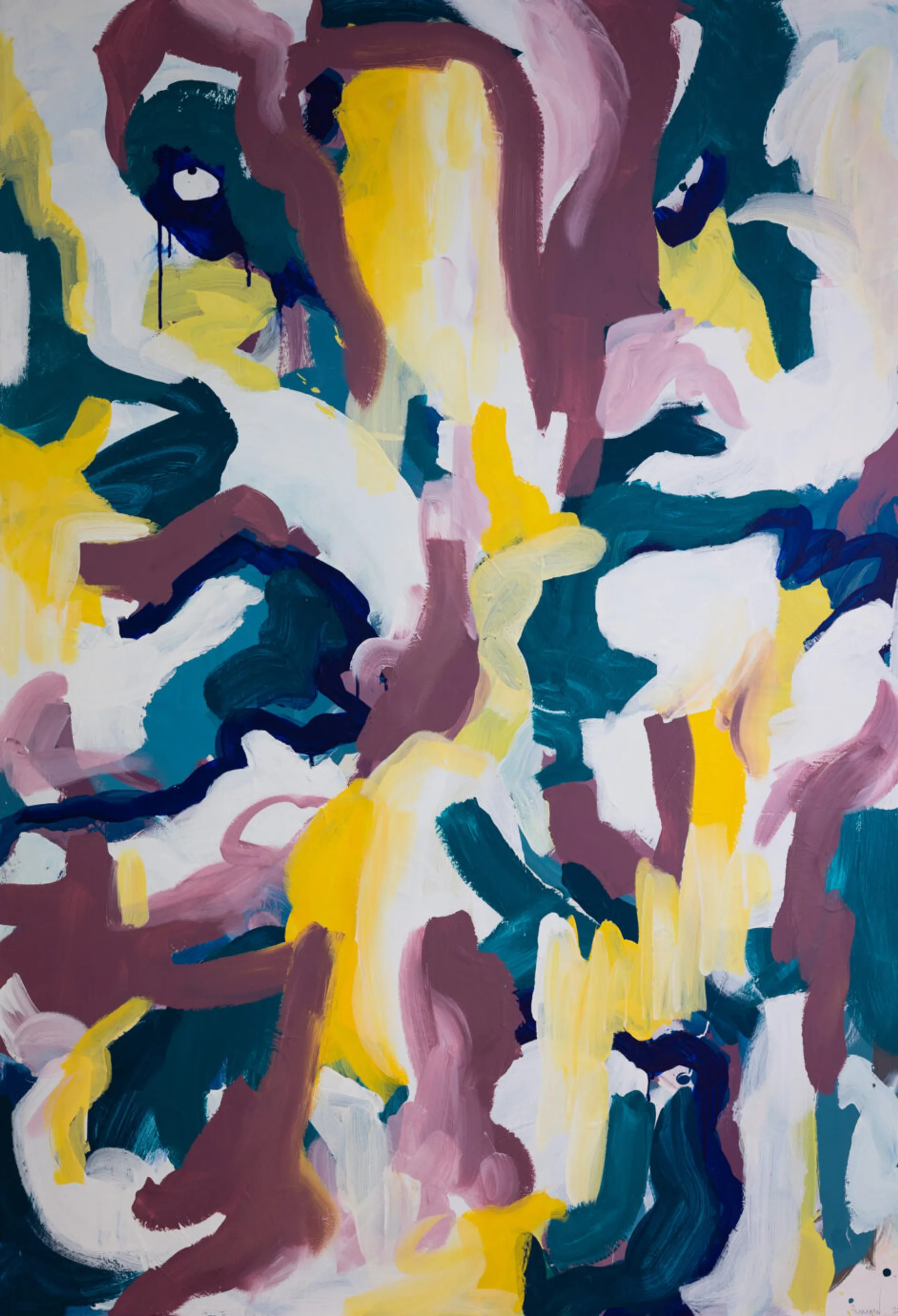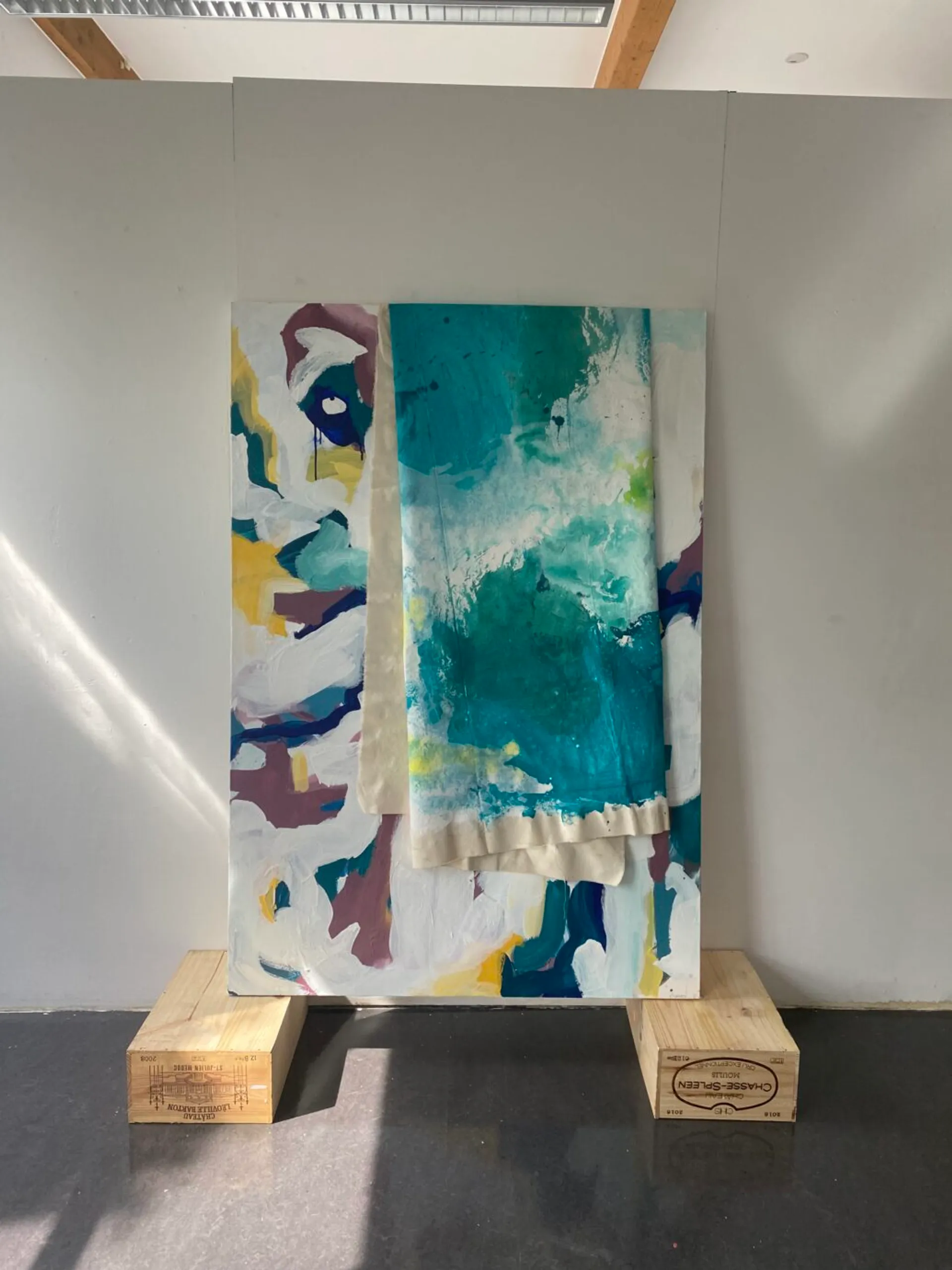 There is a standing wall in the end left corner to show some of my prep sketches/paintings, this was a way for me to bring/ give a hint to my studio— bringing my studio into the show. My studio is my safe space, MY space. It is where I feel anything is possible and I am not judged (at least not by anyone other than myself). Bringing this wall of prep sketches into my part of the show makes me feel as though the spectator can get a better understanding of how my brain works and how I construct my practice.