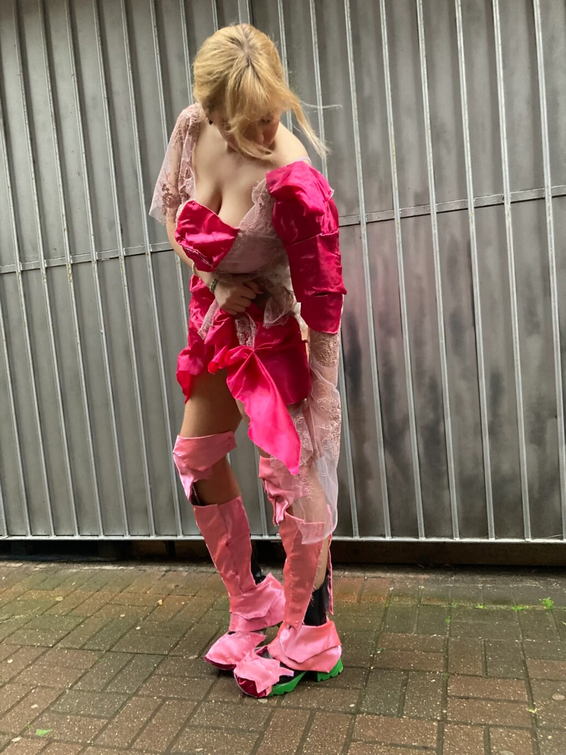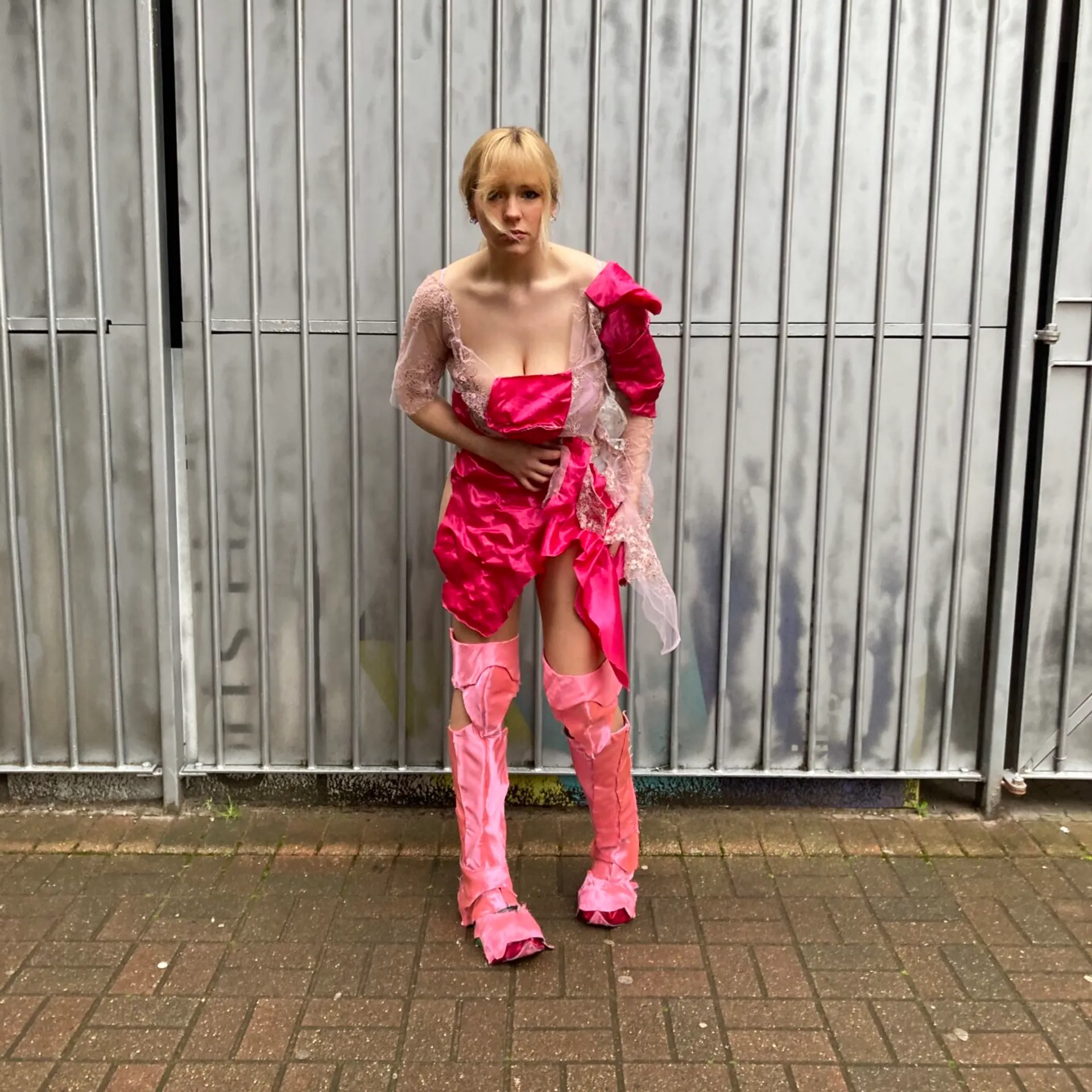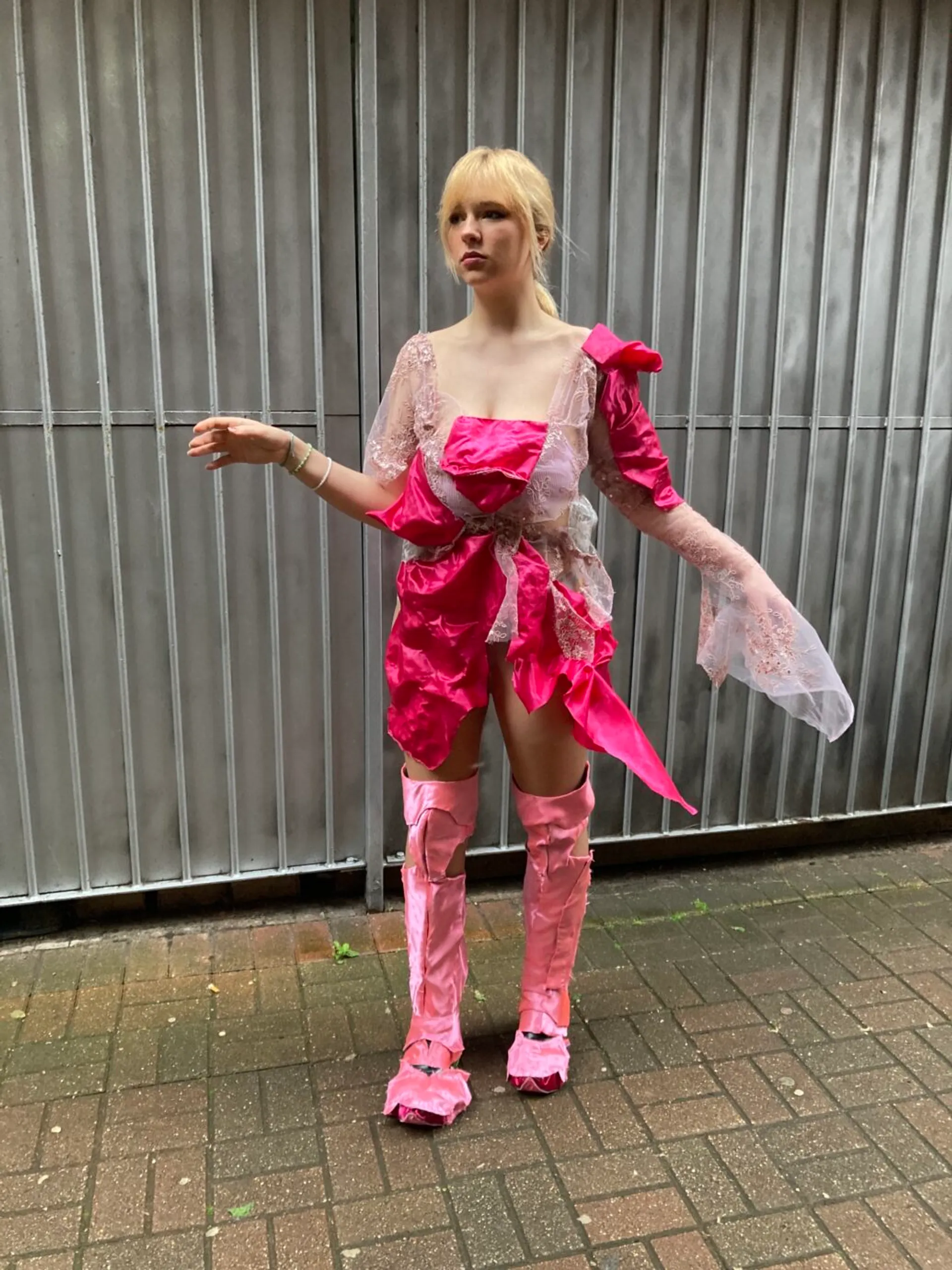 I have created a garment that aims to capture the dissonance between the public persona, and the private interior self within an individual. To visually manifest these waring halves, I constructed pieces that draw upon the silhouettes and composition of medieval armour. The armour represents how the ego and public personas we design for ourselves provide protection for our vulnerable true self. My piece captures the archetypical suit of armour at a moment of abstraction as it is beginning to break apart exposing the individual’s fragility. I also hyperfeminized the garment and used delicate fabric like lace to signify the frailty and inevitable breakdown of a constructed persona that strives to conceal an individual’s true character.